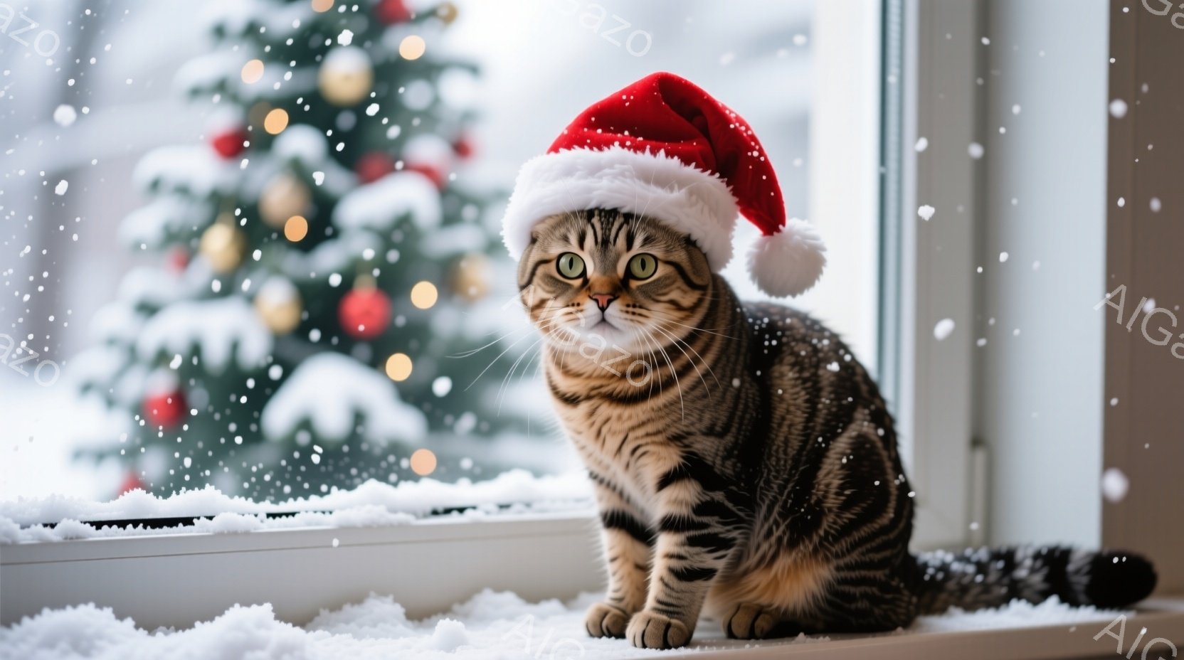 縞模様の猫が、頭にサンタクロースの帽子をかぶって窓枠に座っています。背景にはぼやけたクリスマスツリーと雪が舞う冬景色が見え、猫は少し警戒したような、または好奇心旺盛な表情で正面を見ています。全体的に、温かく、お祝いムードいっぱいの雰囲気です。