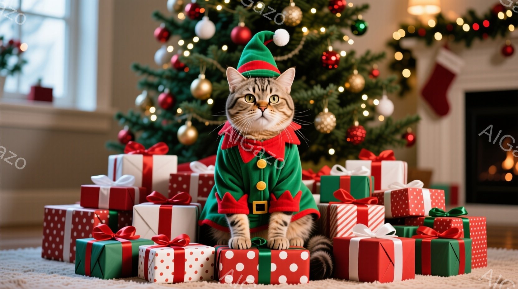 縞模様の猫が、クリスマスツリーの背景の前でプレゼントの山の上に座っています。緑色のコスチュームを着ており、赤い襟とベルトが特徴的で、頭にはクリスマスの帽子をかぶっています。プレゼントは様々な色の包装紙で飾られており、全体的に暖かく、お祝いの雰囲気です。