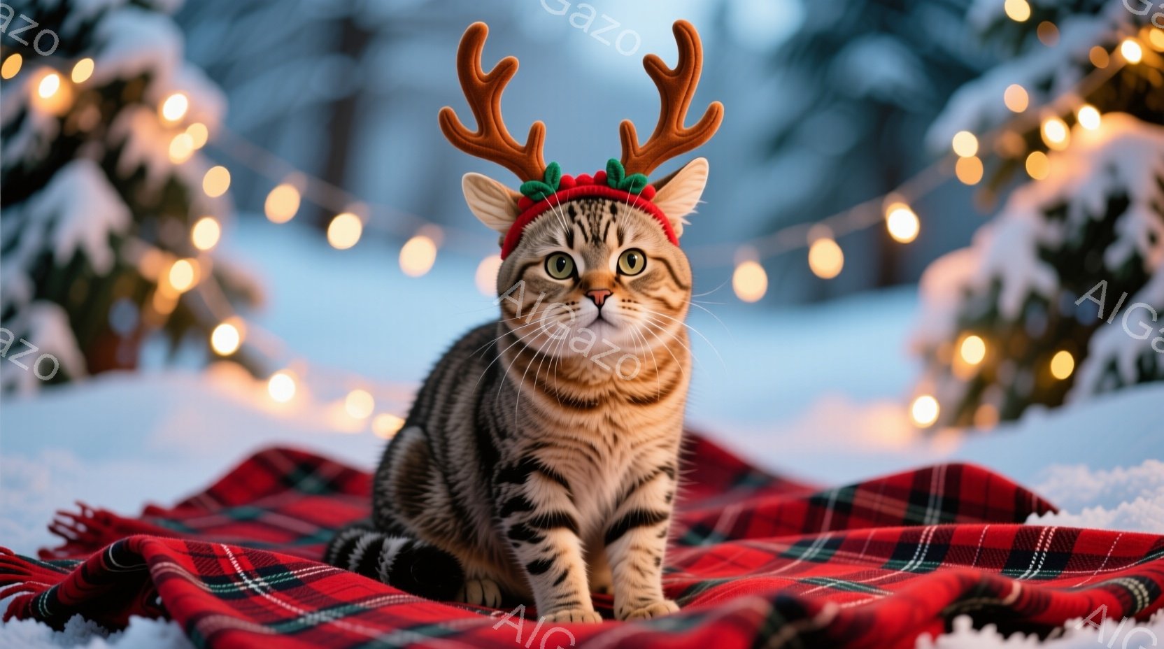 茶色と黒の縞模様の猫が、赤いチェック柄の毛布の上に座っており、頭には小さなトナカイの角をつけています。猫はカメラに向かってまっすぐ見つめ、穏やかで少しいたずらっぽい表情をしています。背景には雪景色とぼやけたクリスマスツリーの光が広がり、暖かく穏やかな冬の雰囲気を醸し出しています。