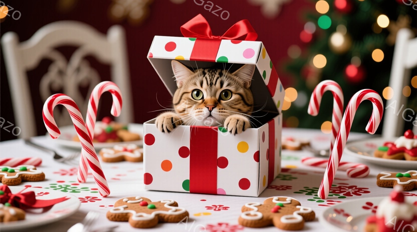 箱の中に猫が顔を出している写真です。背景には、ジンジャーブレッドクッキーやキャンディケーンが散りばめられたテーブルが広がっており、クリスマスらしい華やかな雰囲気を醸し出しています。猫は少し驚いたような表情で、好奇心旺盛に周囲を見渡しているようです。