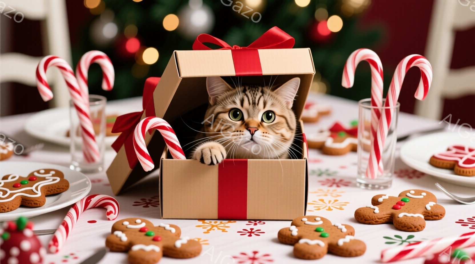 クリスマスをテーマにしたテーブルの上に、赤い水玉模様のギフトボックスから顔を出した子猫がいます。子猫は好奇心旺盛な表情でカメラを見つめており、ボックスの縁に前足をかけています。背景には、クリスマスツリーの光とジンジャーブレッドクッキー、そしてキャンディケーンが散りばめられ、温かくお祝いムードに満ちた雰囲気が漂っています。