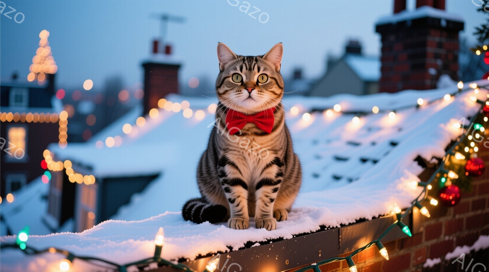 雪の上に座っているトラ柄の猫が、赤い蝶ネクタイを身につけてこちらを見ている。背景には、イルミネーションが輝く建物や木々がぼやけており、冬の夜の穏やかで幻想的な雰囲気が漂っている。猫の表情は落ち着いており、クリスマスの装飾と相まって、温かく愛らしい印象を与える。
