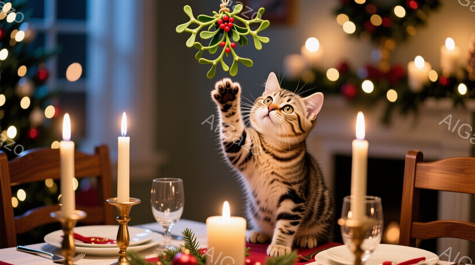 縞模様の小さな子猫が、ミズトー(ヤドリギ)の枝を前足で触ろうとしています。背景には、キャンドルが灯されたテーブルと、ぼやけたクリスマスツリーの光があり、温かくお祝いムードの室内が広がっています。クリスマスらしい装飾が散りばめられた、穏やかで幸せな雰囲気の写真です。