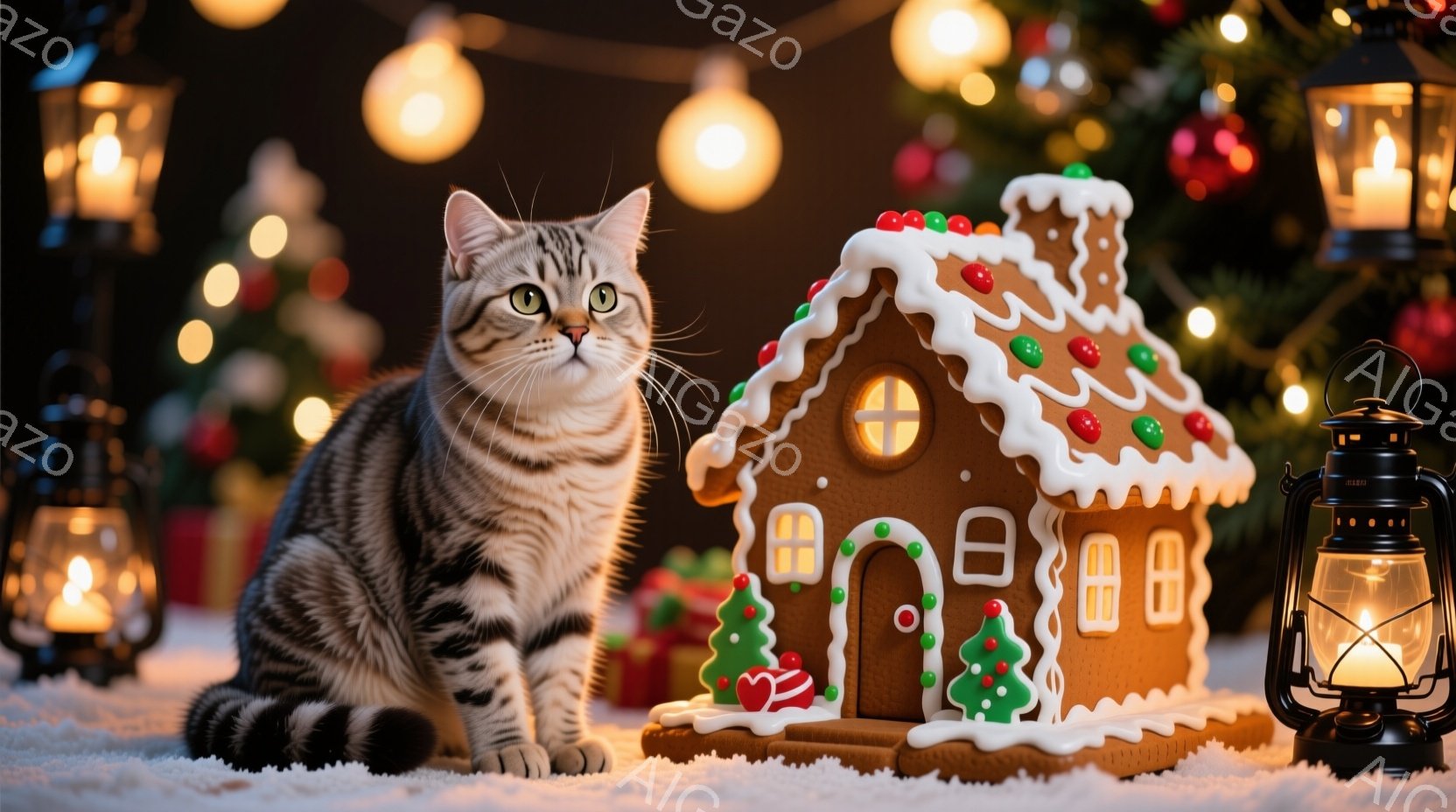 縞模様の猫が白い毛布の上に座り、少し上目遣いでこちらを見ている。背景には、クリスマスの飾り付けの施されたツリーや、点灯された赤いランタン、そして精巧なジンジャーブレッドハウスが置かれている。全体的に暖かく、お祝いの雰囲気を醸し出しており、クリスマスの季節を感じさせる一枚だ。