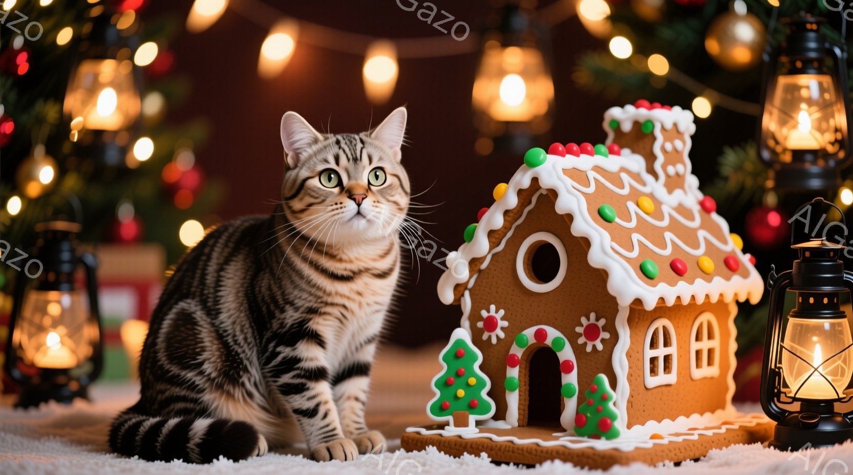 縞模様の猫が、雪の上に座って正面を見つめています。背景にはクリスマスツリーの光がぼんやりと見え、可愛らしいジンジャーブレッドハウスと光るランタンが置かれています。暖かく、お祝いムードにあふれた、冬のクリスマスの情景です。