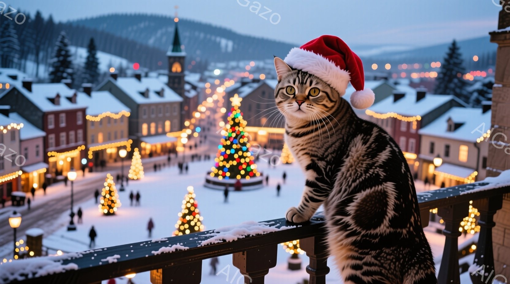 クリスマス柄の帽子とタータンチェックのスカートを身に着けた縞模様の猫が写っています。猫はバルコニーの手すりに座り、遠くに見えるクリスマスマーケットを見つめています。背景には、雪に覆われた建物、きらめくイルミネーション、そして暖かい光に照らされた賑やかな市場があり、祝祭の雰囲気を醸し出しています。