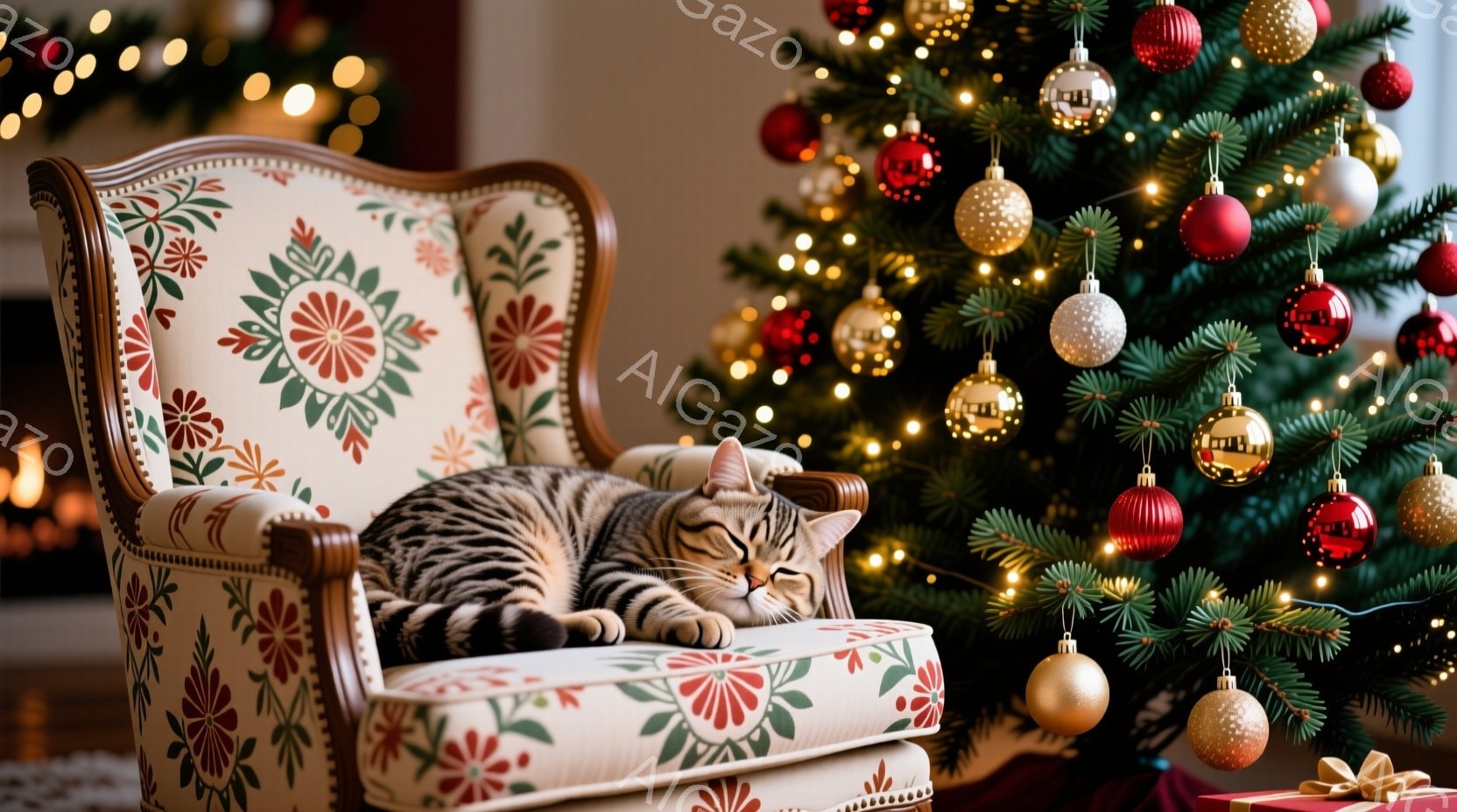 縞模様の猫が、花柄の肘掛け椅子に丸まって眠っています。背景には、オーナメントで飾られたクリスマスツリーがぼんやりと見え、温かみのある光が部屋全体を照らしています。リラックスした猫と華やかな背景が、穏やかで心地よい雰囲気を醸し出しています。