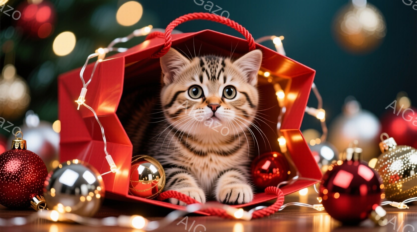 赤いギフトバッグの中に、縞模様の小さな子猫が座っており、前足を伸ばしてこちらを見ています。背景には、様々な色のクリスマスオーナメントや光の装飾が散りばめられ、お祝いムードを演出しています。全体的に暖かく、愛らしい雰囲気が漂う、クリスマスの季節にぴったりの写真です。