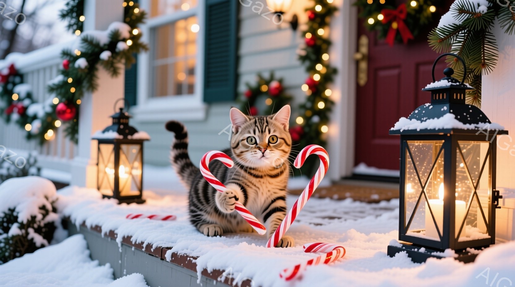 雪が降り積もった家の玄関に、縞模様の猫が立っている。猫は赤い縞模様のキャンディケーンを口にくわえ、好奇心と少しのいたずらっぽさを含んだ表情でこちらを見ている。背景にはクリスマスリースや点灯したランタンがあり、暖かい祝祭の雰囲気を醸し出している。