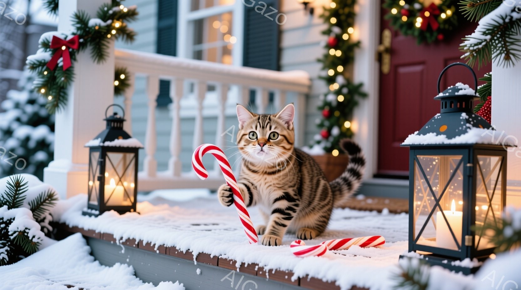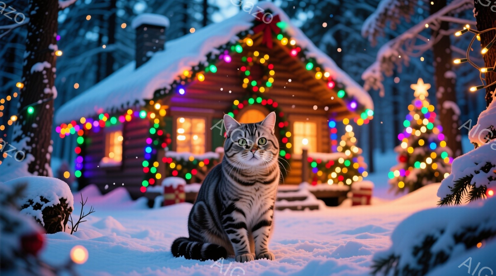 雪景色の中に座る縞模様の猫が写っています。猫は正面を見ており、落ち着いた表情をしています。背景には、クリスマスライトで飾られた可愛らしい丸太小屋があり、雪が降り積もる冬の暖かく幻想的な雰囲気を醸し出しています。