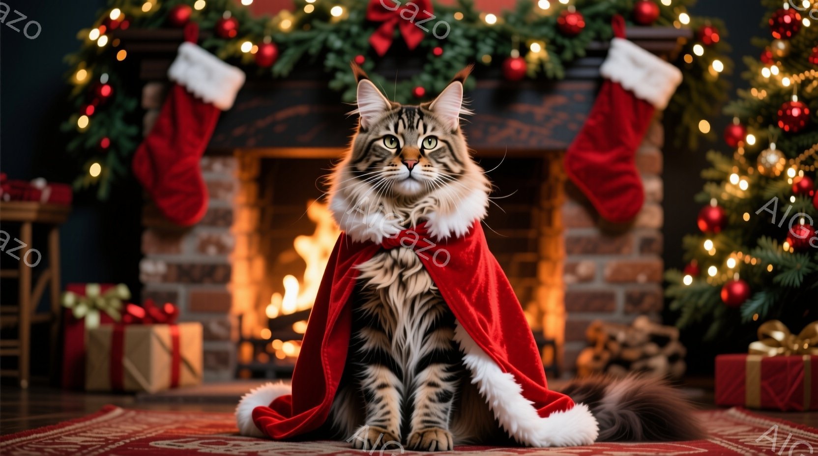 縞模様の大きな猫が、白い縁取りの赤いケープを羽織って正面を向いて座っています。背景には、クリスマスツリー、暖炉、プレゼント、クリスマスストッキングがあり、温かくお祝いの雰囲気が漂っています。猫は自信に満ちた表情で、冬のホリデーシーズンの象徴として、居心地の良い空間に調和しています。