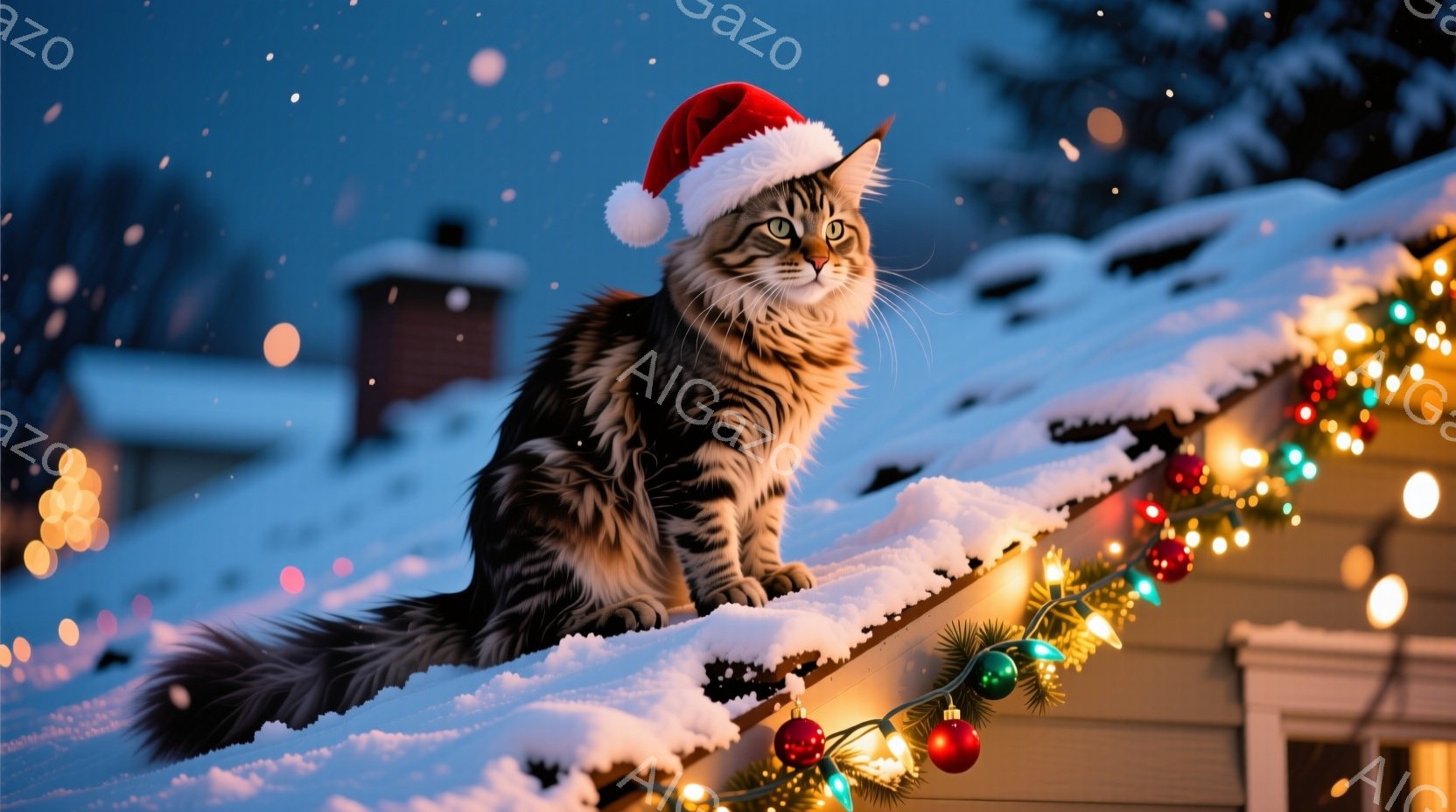 屋根の上に、クリスマスの帽子をかぶった縞模様の猫が座っています。猫は少し上目遣いで、どこか余裕のある表情をしています。背景には雪で覆われた屋根、煙突、そしてきらめくクリスマスライトがあり、冬の暖かく幻想的な雰囲気を醸し出しています。