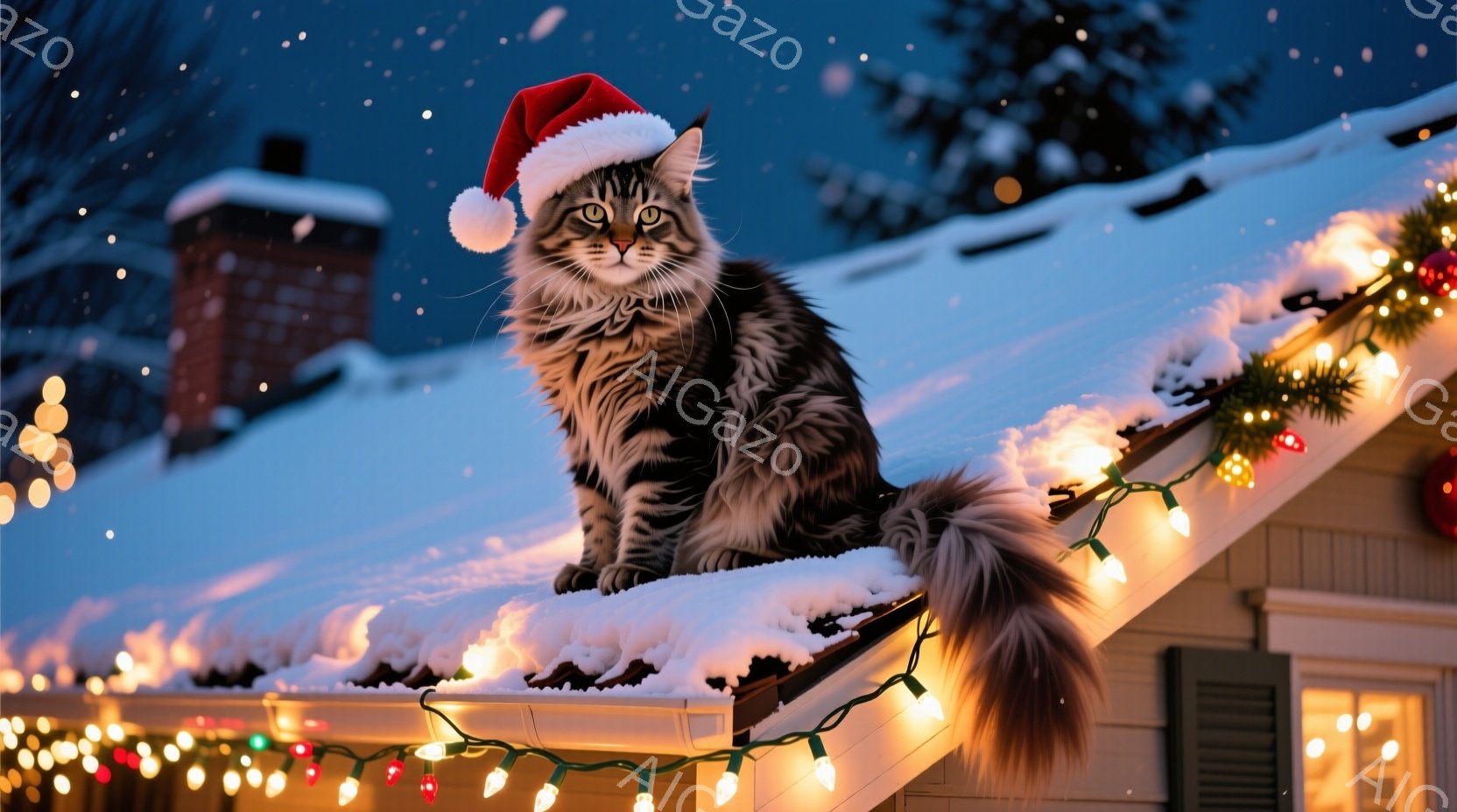 縞模様の猫がサンタ帽をかぶり、雪積もった屋根の上で座っています。背景には、クリスマスの飾り付けが光り、雪が降る冬の夜の穏やかな雰囲気が漂っています。猫は少し遠くを見つめ、リラックスした表情で季節の温かさを表現しています。