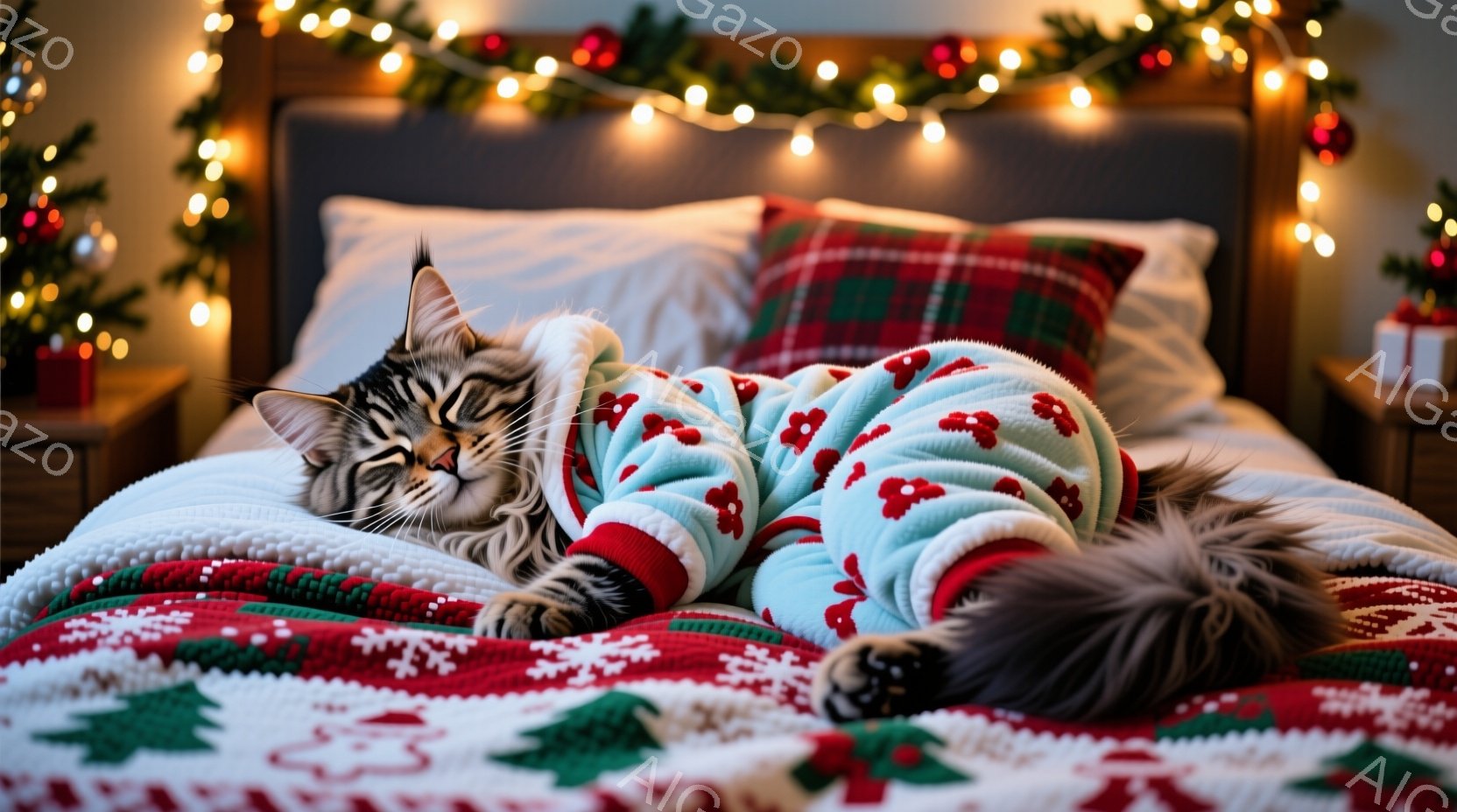 縞模様の猫が、クリスマス柄の毛布にくるまってベッドの上で眠っています。背景には、クリスマスツリーと点滅するライトがあり、暖かく、居心地の良い雰囲気を醸し出しています。ベッドのシーツと枕カバーもクリスマスをテーマにしたデザインで、季節感を楽しめます。