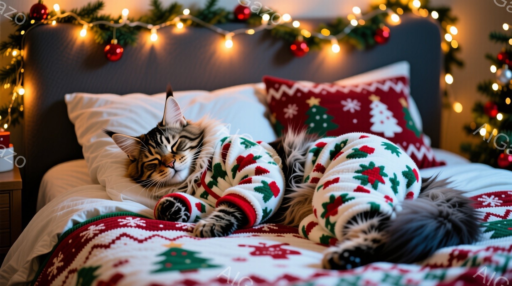 縞模様の猫がクリスマスの模様のベッドに横たわり、水玉模様のパジャマのような服を着ています。猫は目を閉じ、リラックスした表情で、毛むくじゃらの尻尾がベッドから少しはみ出しています。背景にはクリスマスツリーと輝くイルミネーションがあり、暖かく心地よいクリスマスの雰囲気を醸し出しています。
