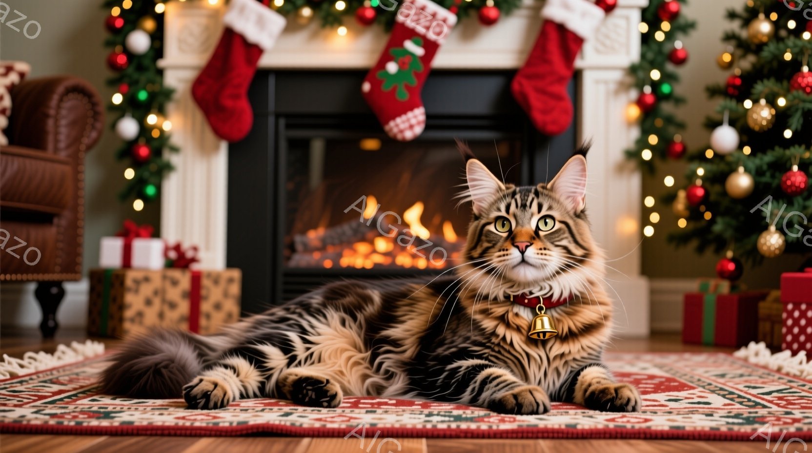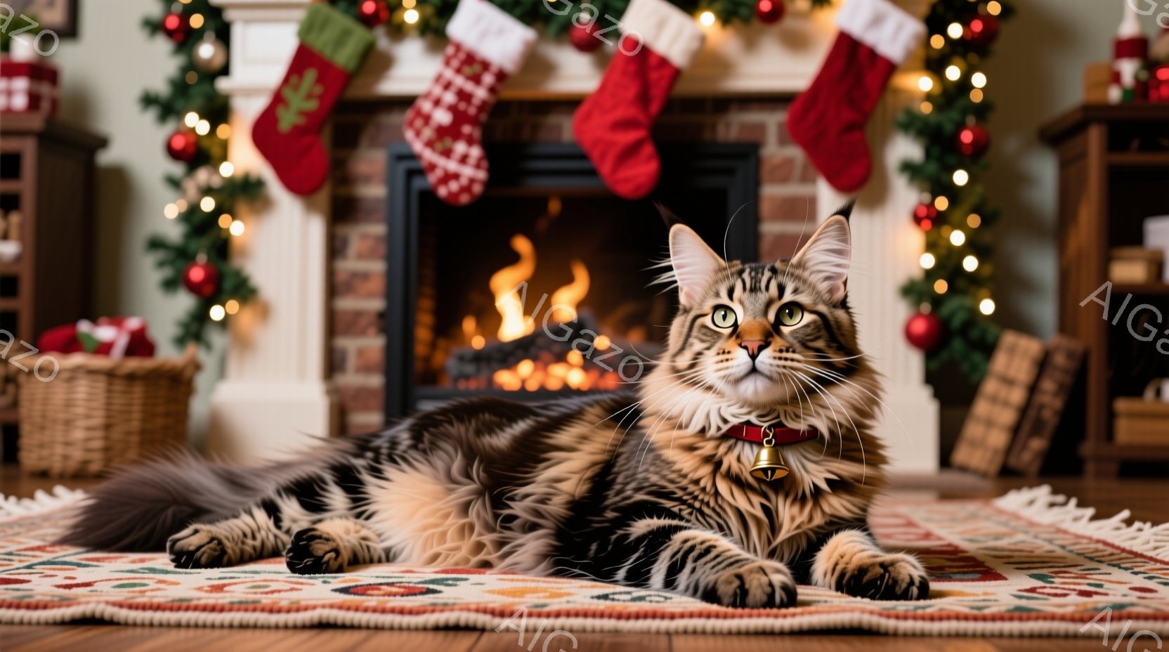 明るい部屋の中央に、縞模様の大きな猫がカーペットの上に横たわっています。猫は首輪をつけており、リラックスした表情で正面を見つめています。背景には、クリスマスツリーや暖炉、そしてクリスマスストッキングが飾られた、暖かくお祝いムード満点の室内が広がっています。