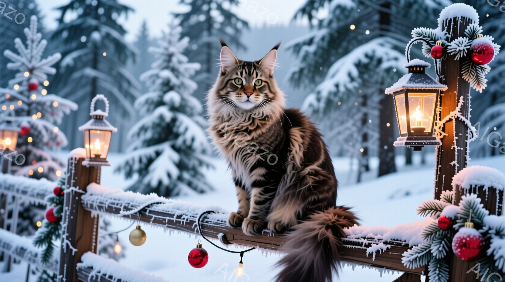 この無料AI生成画像「縞模様の大きな猫が、雪に覆われた木のドアのそばで身構えています。クリスマスツリーのリースがドアに飾られており、雪が降り積もる冬の風景が広がっています。猫は注意深く何かを見つめており、毛並みはふっくらとして冬の寒さをしのいでいるようです。」は、2025年10月22日に作成されました。 サイズは 1664×928px の高解像度で、商用利用も可能なフリー素材として提供しています。