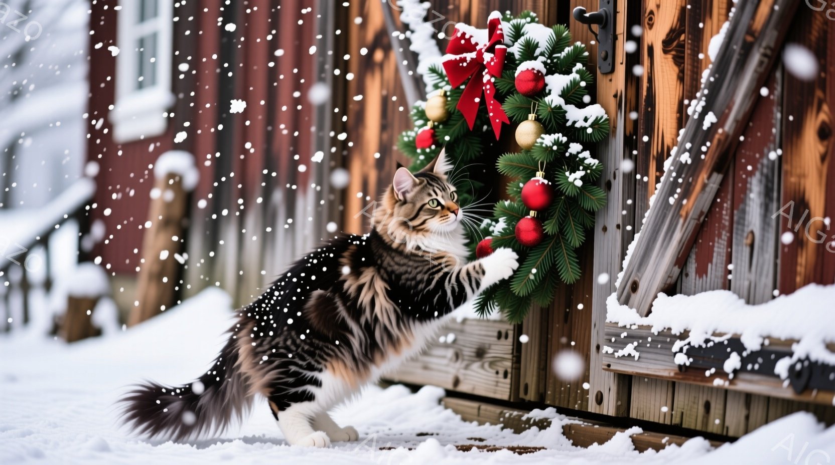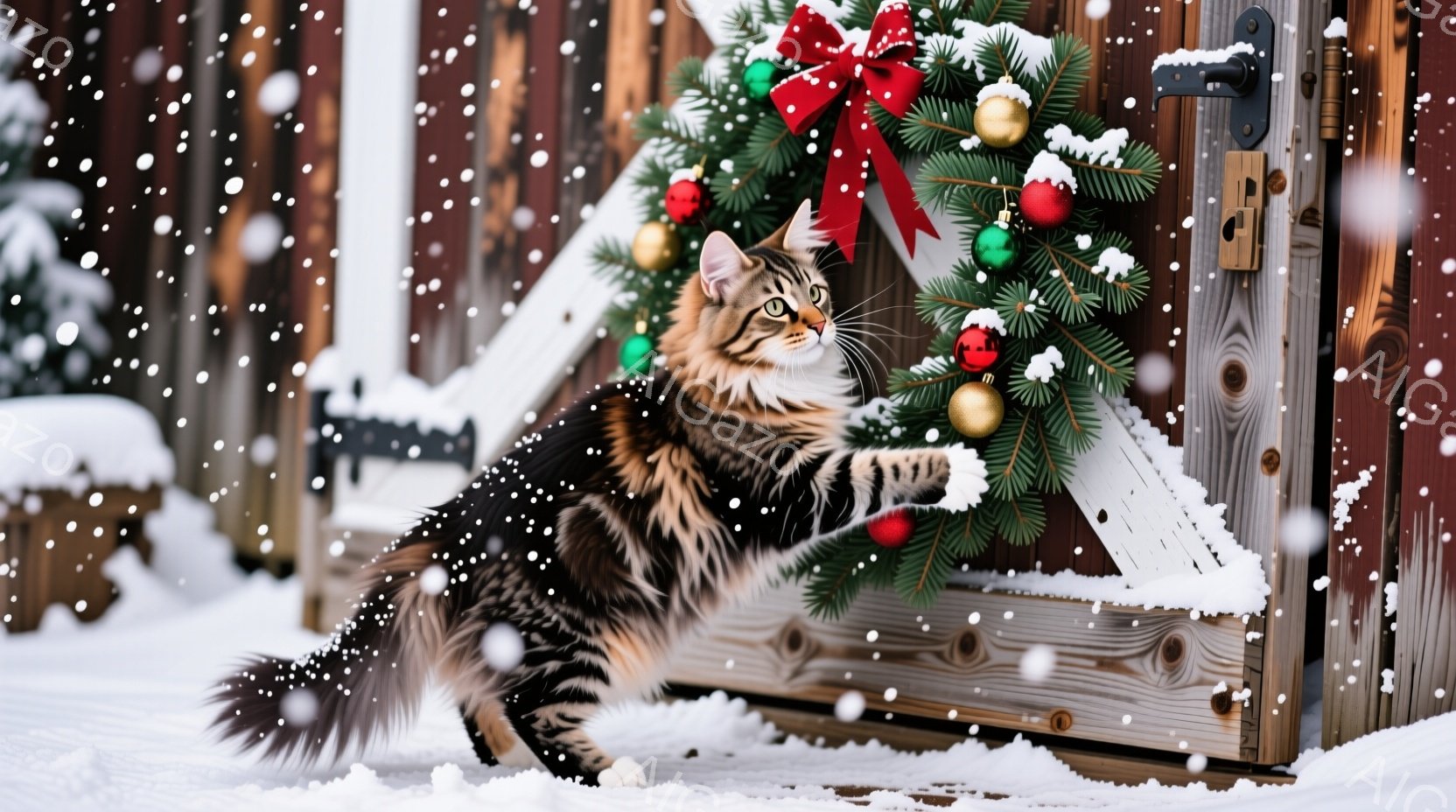 長毛の縞模様の猫が雪の上に立っており、その視線は何かを捉えようとしています。背景には、赤いリボンと金色のオーナメントで飾られたクリスマスリースが飾られた、赤茶色の木製の壁があります。雪が舞い降りており、全体的に暖かく、冬のホリデースピリットを感じさせる静かで穏やかな雰囲気です。