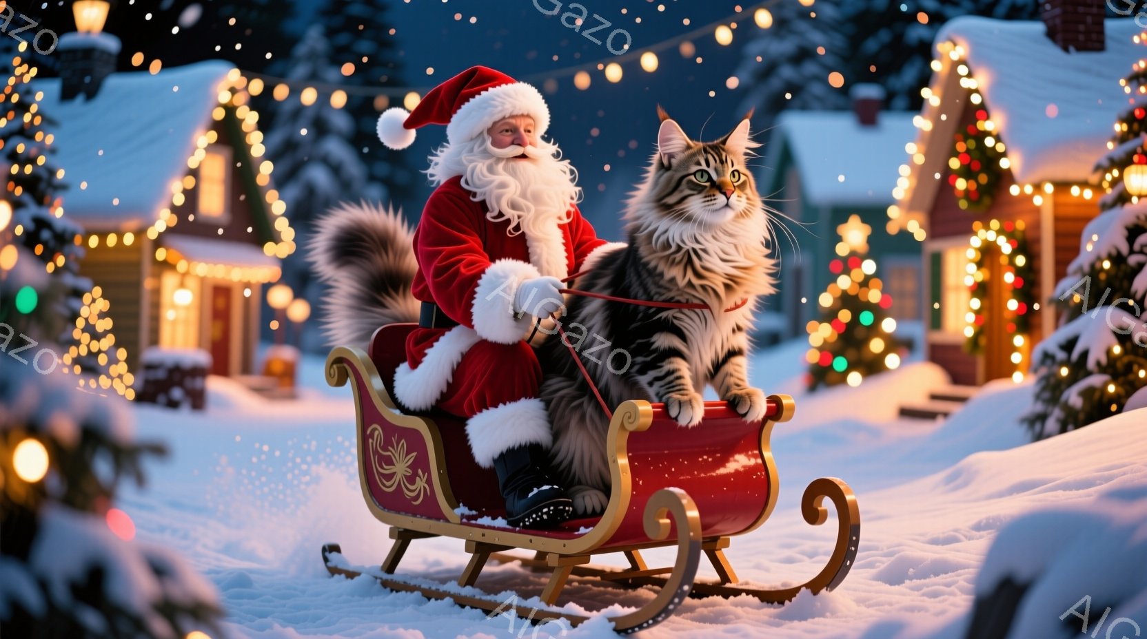 白い雪景色の中で、サンタの衣装を着た猫がそりに乗って進んでいます。猫は赤い衣装と白い毛皮の縁取り、サンタ帽を着用し、片手でそりのひもを引き、自信に満ちた表情をしています。背景には、クリスマスライトで飾られた家々が並び、雪が舞い散る幻想的な冬の夜の雰囲気を醸し出しています。