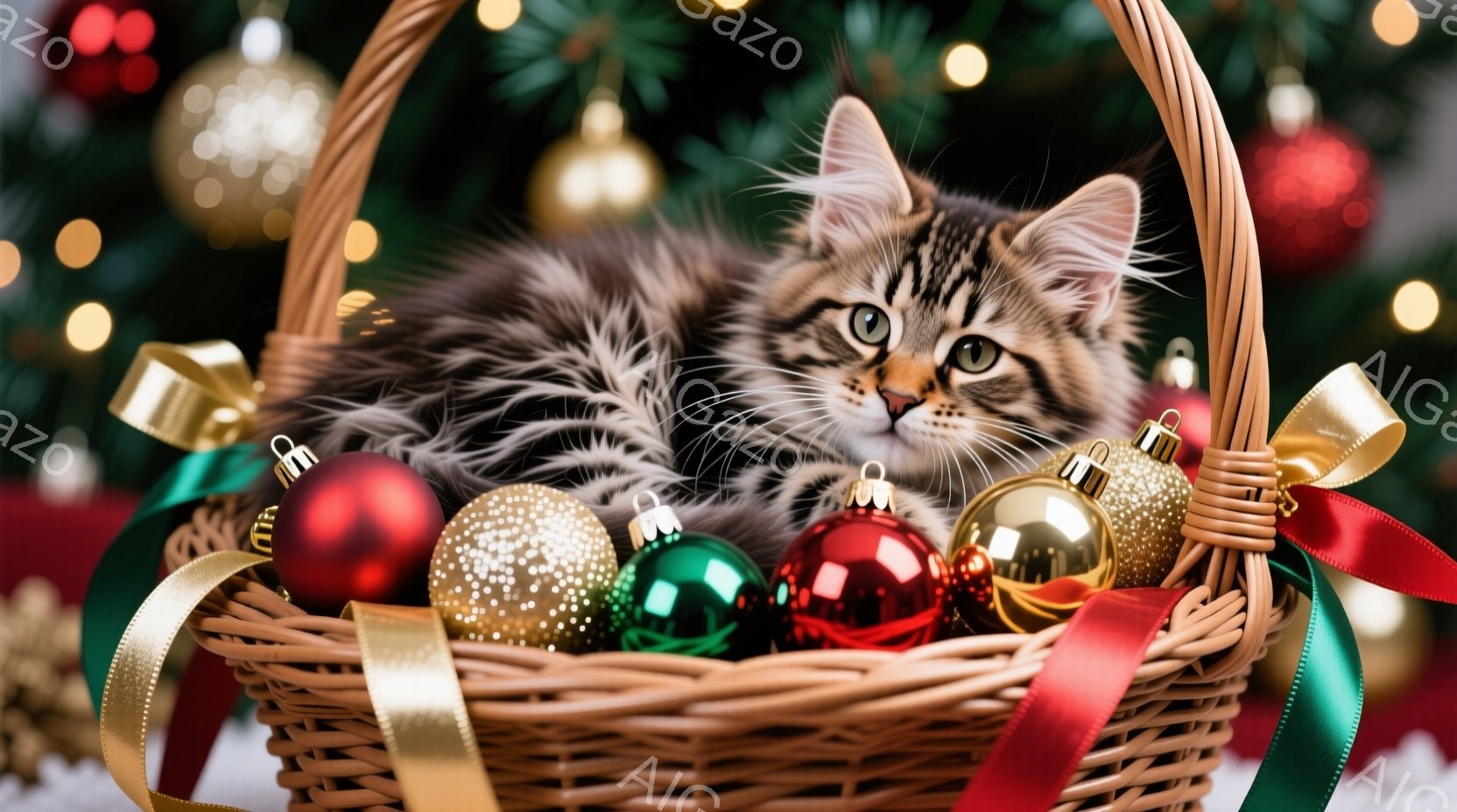 この無料AI生成画像「縞模様の猫が雪景色の中で、チェック柄のマフラーを巻いて座っています。背景には、ライトアップされたクリスマスツリーや雪山が連なり、オーロラが空を彩っています。雪が舞い降りる幻想的な冬の風景で、猫は穏やかで少し気品のある表情をしています。」は、2025年10月22日に作成されました。 サイズは 1664×928px の高解像度で、商用利用も可能なフリー素材として提供しています。
