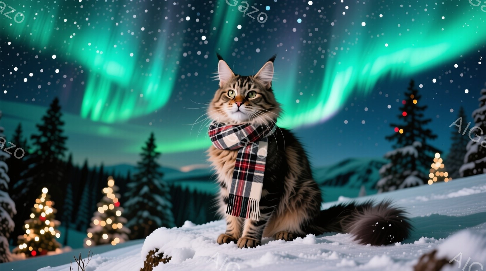 縞模様の猫が雪景色の中で、チェック柄のマフラーを巻いて座っています。背景には、ライトアップされたクリスマスツリーや雪山が連なり、オーロラが空を彩っています。雪が舞い降りる幻想的な冬の風景で、猫は穏やかで少し気品のある表情をしています。