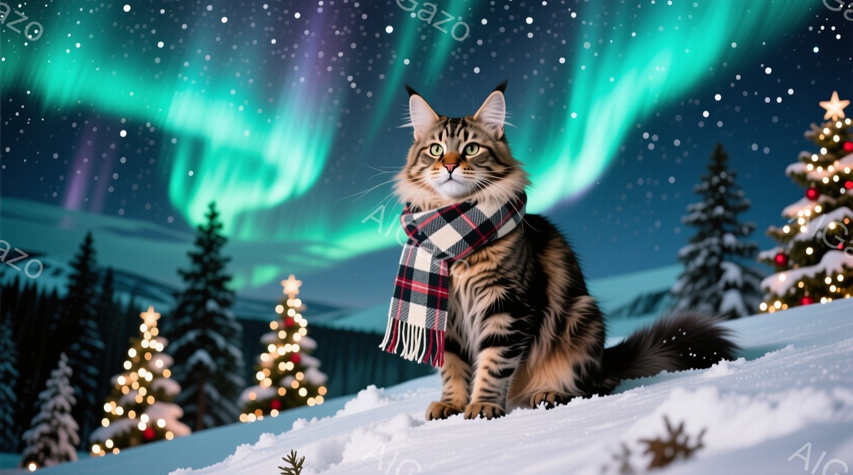 灰色の縞模様の大きな猫が雪景色の中で座っており、首に赤と黒のチェック柄のスカーフを巻いています。背景には、針葉樹の森と、オーロラのように輝く空が広がっており、遠くには雪に覆われた山々が見えます。全体的に、冬の幻想的な雰囲気が漂う、温かく、魅力的な光景です。