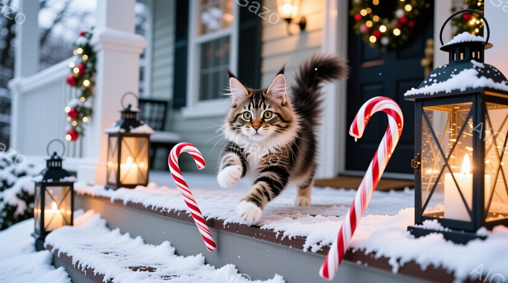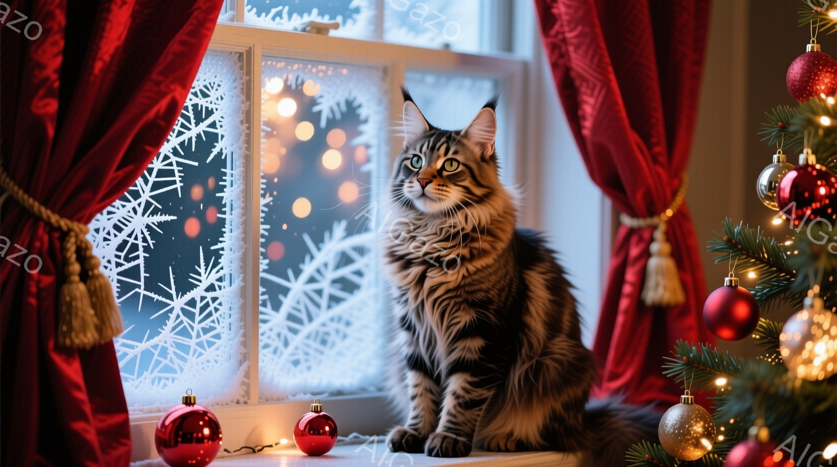長毛の縞模様の猫が窓辺に座り、外を眺めている。背景には雪の結晶が描かれた窓と、クリスマスツリーの飾り付けが見え、冬の暖かく穏やかな雰囲気が漂っている。猫は落ち着いた表情で、優雅な姿勢でくつろいでいる。
