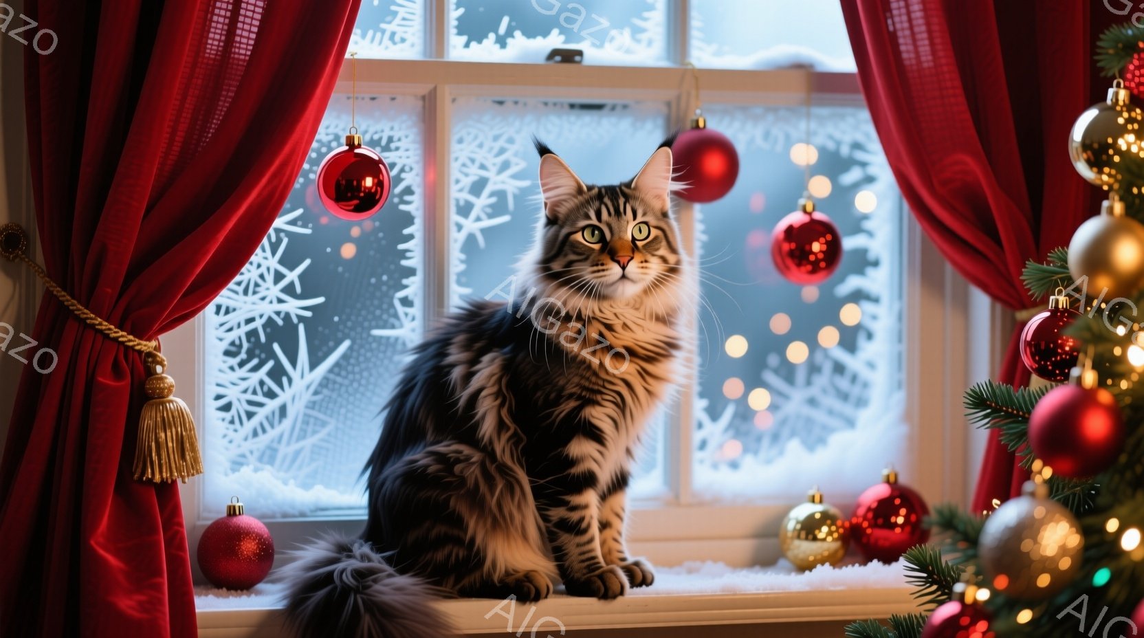 長毛の縞模様の猫が、窓辺に座ってこちらを見ている。窓には雪の結晶の模様が描かれ、背景は夜の雪景色で、暖かくクリスマスの雰囲気が漂っている。赤いベルベットのカーテンと、クリスマスツリーのオーナメントが、猫の周りを彩っている。