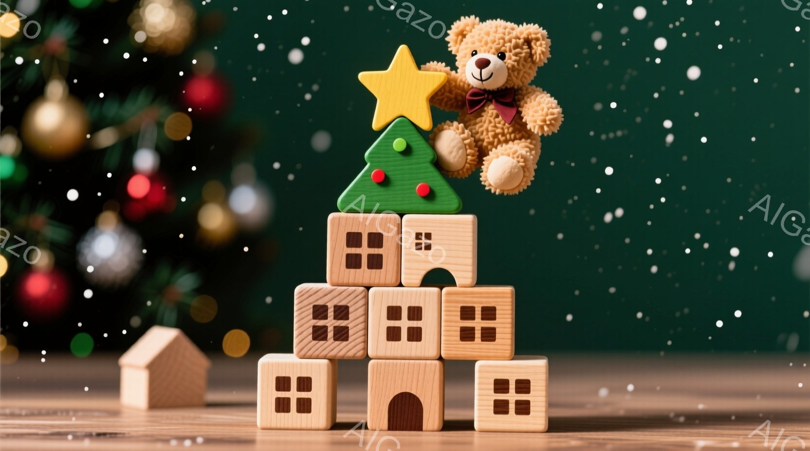温かい緑色の背景に、木製のブロックで作られた小さな塔があり、その頂上に茶色のテディベアが座っています。テディベアは赤いリボンをつけており、笑顔で前を見つめています。背景にはぼやけた金色の光が点在し、小さなお家型のブロックがいくつか散らばり、クリスマスの雰囲気を感じさせる温かく居心地の良い光景です。