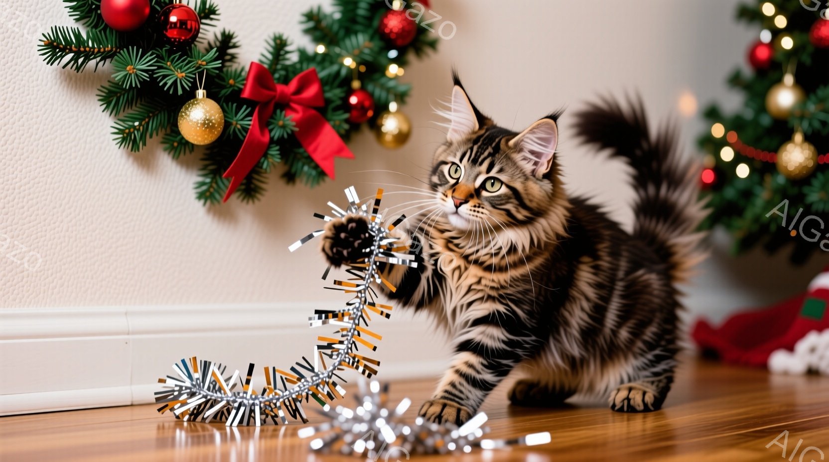 縞模様の茶色のキティが、銀色のクリスマスデコレーションを前足で遊んでいます。キティは座って、興味津々とした表情でデコレーションを見つめており、遊び心に満ちた様子が伝わってきます。背景にはクリスマスツリーの枝とオーナメントが見え、暖かく華やかなクリスマスの雰囲気が漂っています。