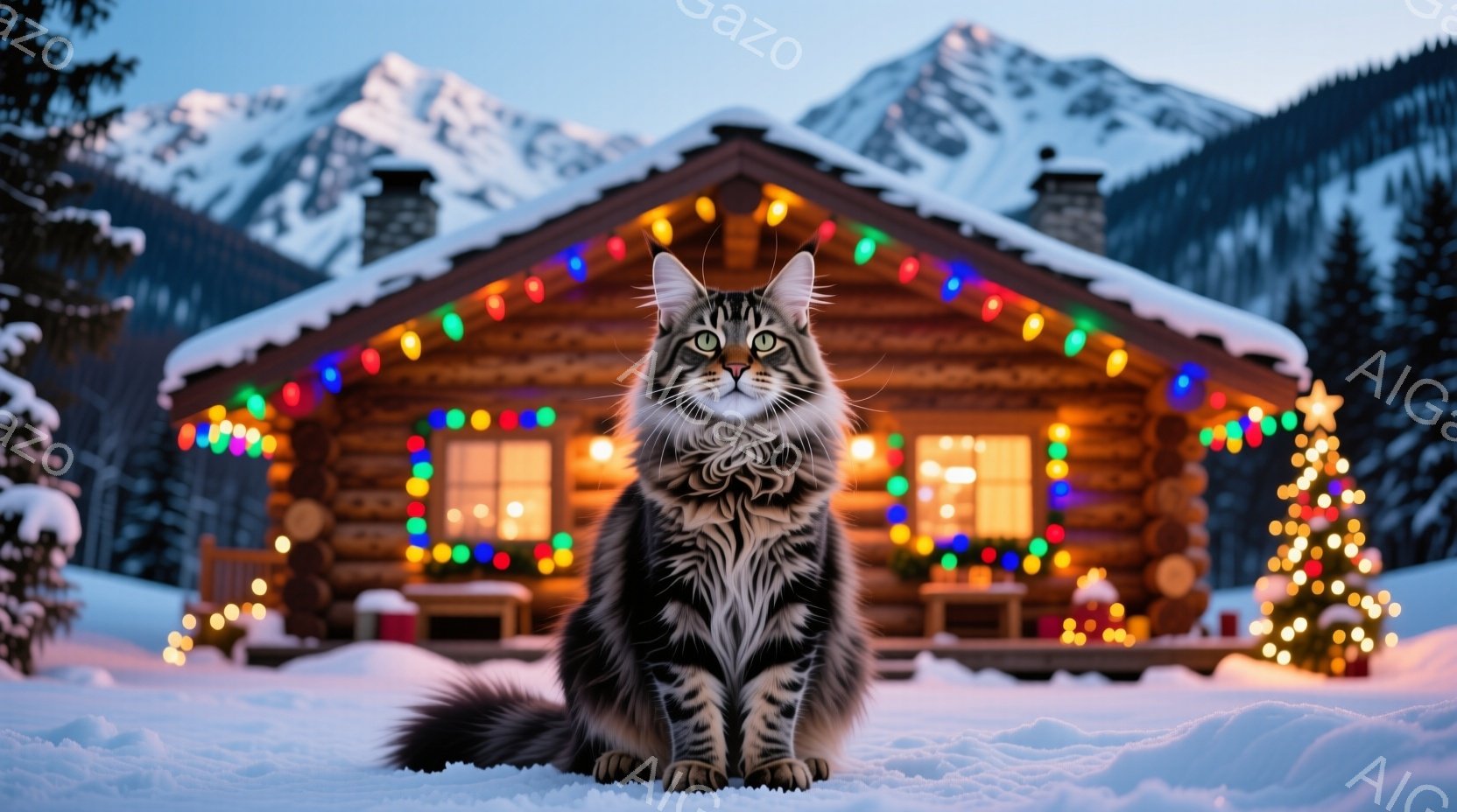 長毛の灰色の猫が雪の上に座っており、正面をまっすぐ見ています。背景には、クリスマスライトで飾られたログハウスと、雪を頂いた山々が広がっています。全体的に暖かく、穏やかで、冬の祝祭の雰囲気が漂っています。