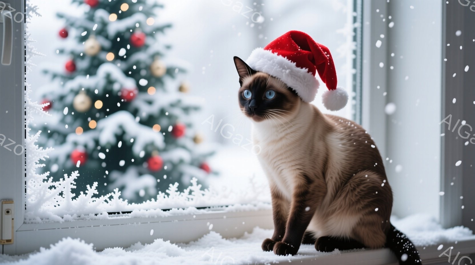 この無料AI生成画像「赤いクリスマスストッキングの中に、クリーム色のシャム猫が丸まって眠っています。ストッキングは暖炉のレンガの壁に掛けられ、背景には暖炉の炎が見え、周囲にはクリスマスツリーの飾りとプレゼント箱が置かれています。全体的に暖かく、お祝いの雰囲気で、クリスマスの喜びが感じられます。」は、2025年10月22日に作成されました。 サイズは 1664×928px の高解像度で、商用利用も可能なフリー素材として提供しています。