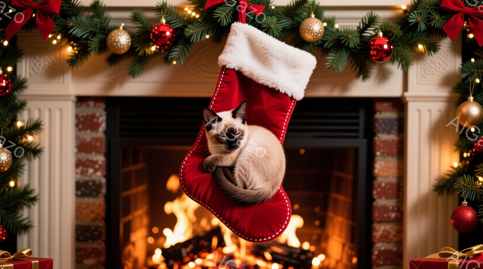 赤いクリスマスストッキングの中に、クリーム色のシャム猫が丸まって眠っています。暖炉の炎がストッキングを照らし、背景にはクリスマスツリーの装飾が華やかに飾られています。温かく、心地よい休日の雰囲気が漂う、魅力的な光景です。
