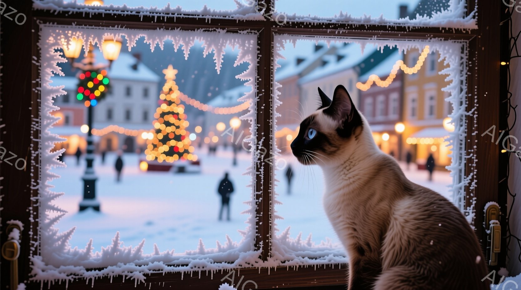 霜で覆われた窓枠に、美しいシャム猫が座り、雪景色を眺めている。背景には、イルミネーションで飾られたクリスマスツリーや建物が立ち並び、静かで幻想的な冬の風景が広がっている。雪が舞い、温かい光が灯る中で、猫は物思いにふけっているようにも見える。