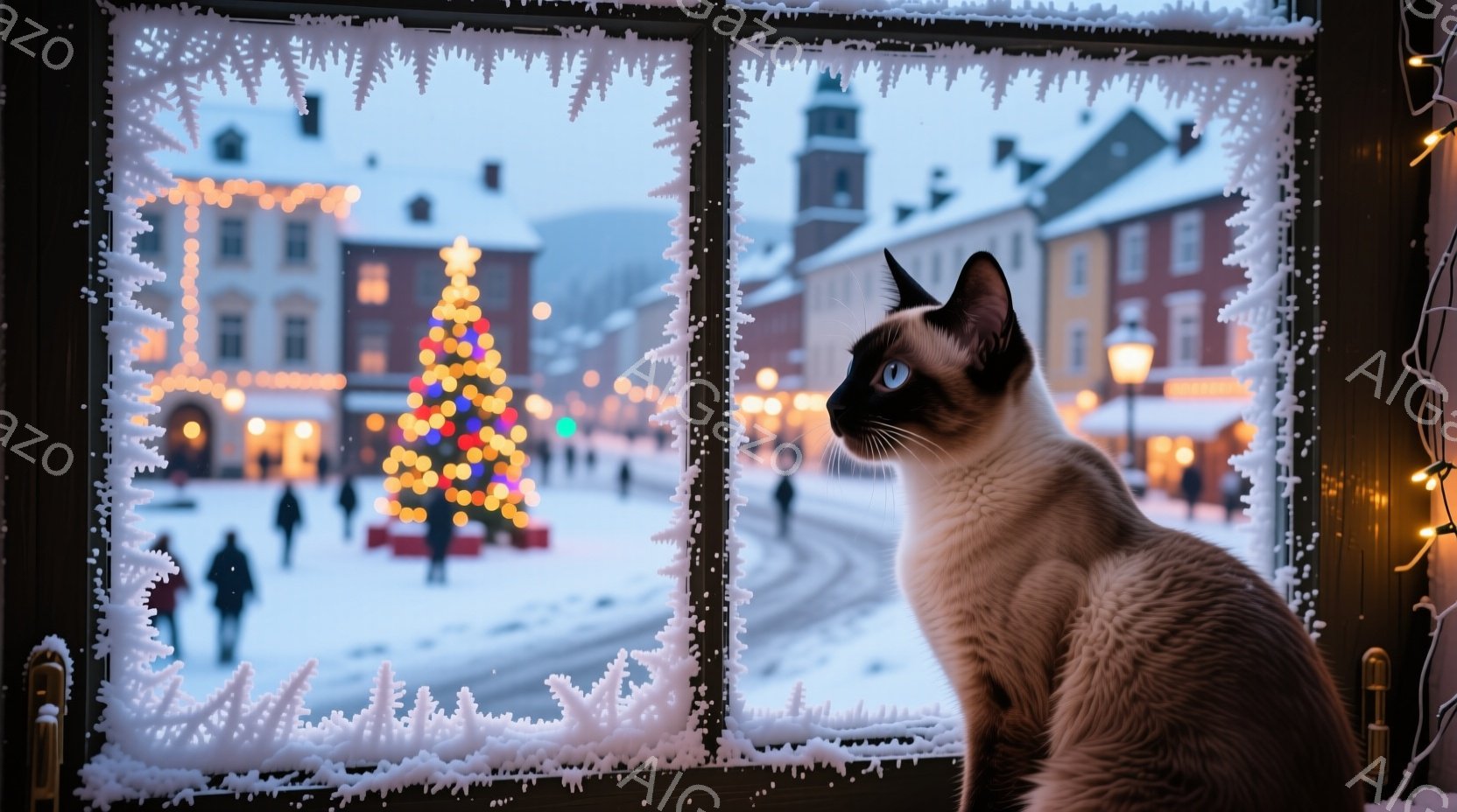 この無料AI生成画像「シーマーズ猫が緑の編み物のマフラーを巻いて雪の上に座っており、前には雪だるまが立っています。雪だるまは赤い縞模様のスカーフ、黒いボタンの目、にんじんの鼻、そして小さな帽子をかぶっており、まばゆいばかりの光のストリングで飾られています。背景にはぼやけた緑の木々と降雪があり、全体的に温かくお祝いの雰囲気が漂っています。」は、2025年10月22日に作成されました。 サイズは 1664×928px の高解像度で、商用利用も可能なフリー素材として提供しています。