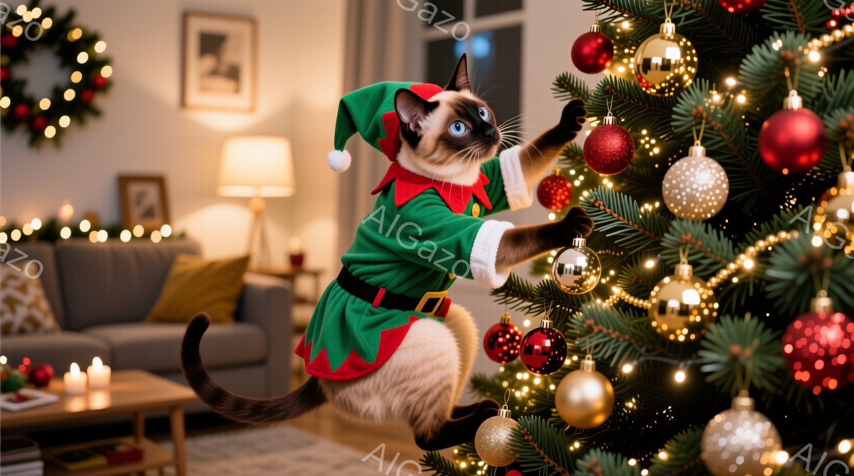 シーロの猫がクリスマスツリーによじ登り、緑と赤の妖精の衣装を着ています。猫は片足を伸ばし、ツリーの飾りを触ろうとしており、顔は少し驚いたような表情をしています。背景には、飾られたクリスマスツリー、ソファ、そして明るく暖かいリビングルームの様子が見え、全体的にクリスマスの温かく楽しい雰囲気が漂っています。