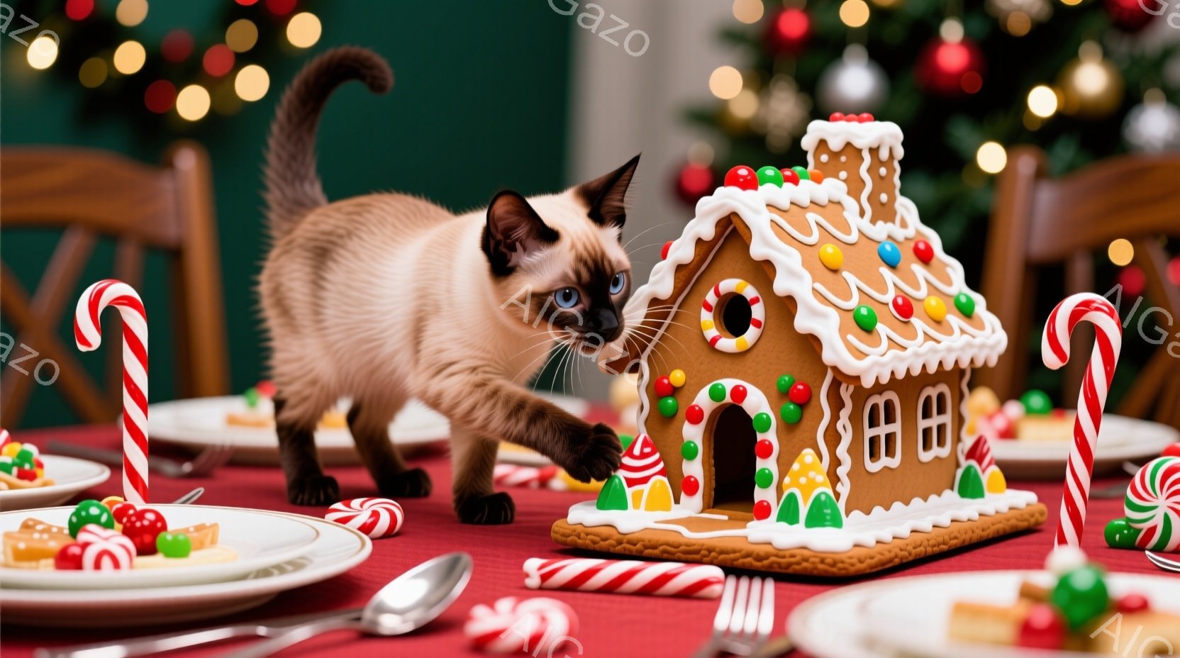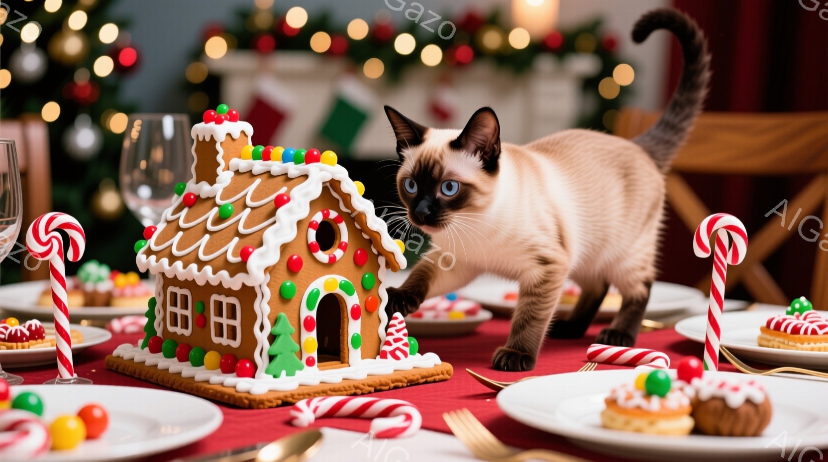 シナモン色のシャム猫が、クリスマスをテーマにしたジンジャーブレッドハウスに向かって歩き出そうとしています。テーブルの上には、キャンディケーンやクッキーなどのクリスマスのお菓子が並べられ、背景にはぼやけたクリスマスツリーの光が見えます。全体的に、暖かく、お祝いムードに包まれた、クリスマスの日の光景です。