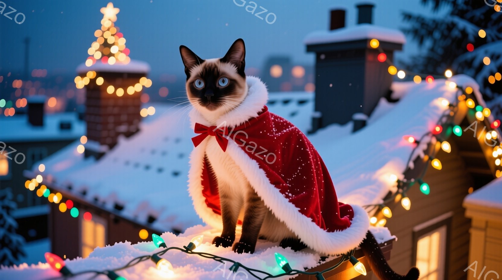 クリーム色の毛皮の縁取りが付いた赤いマントを羽織り、赤いリボンで飾られた、シロクマのような毛並みの猫が雪の屋根の上に座っています。背景には、クリスマスライトで飾られた建物と木々が広がり、薄暗い青色の空が広がっています。全体として、雪景色の中、クリスマスの雰囲気を楽しむ猫の愛らしい姿が描かれています。