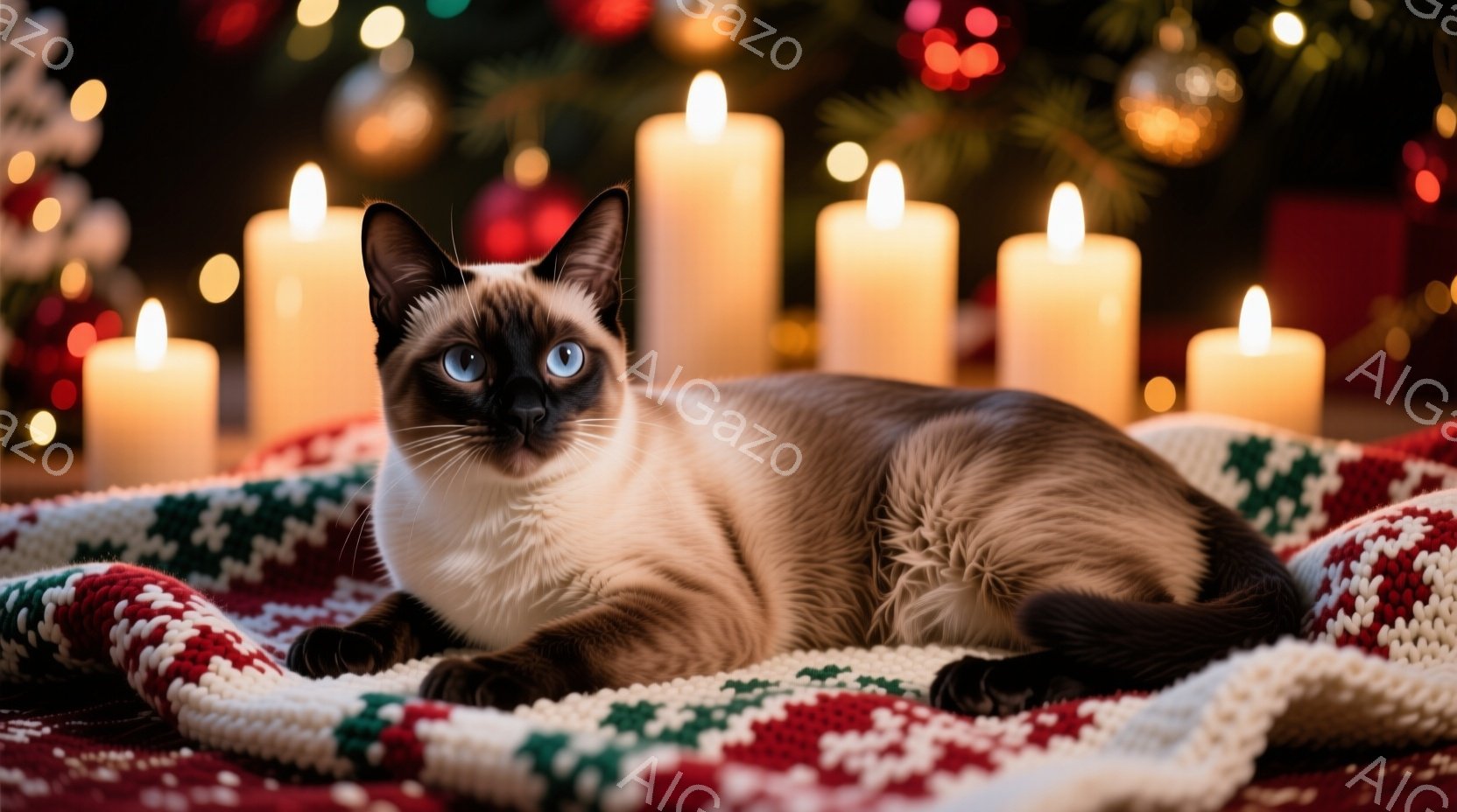 シーマル猫が赤い模様の毛布の上で横たわっており、鮮やかな青い瞳が印象的です。周囲には複数の白い柱状のキャンドルが配置され、背景にはクリスマスツリーのぼやけた光が灯っています。全体的に暖かく、穏やかなクリスマスの雰囲気を醸し出しています。