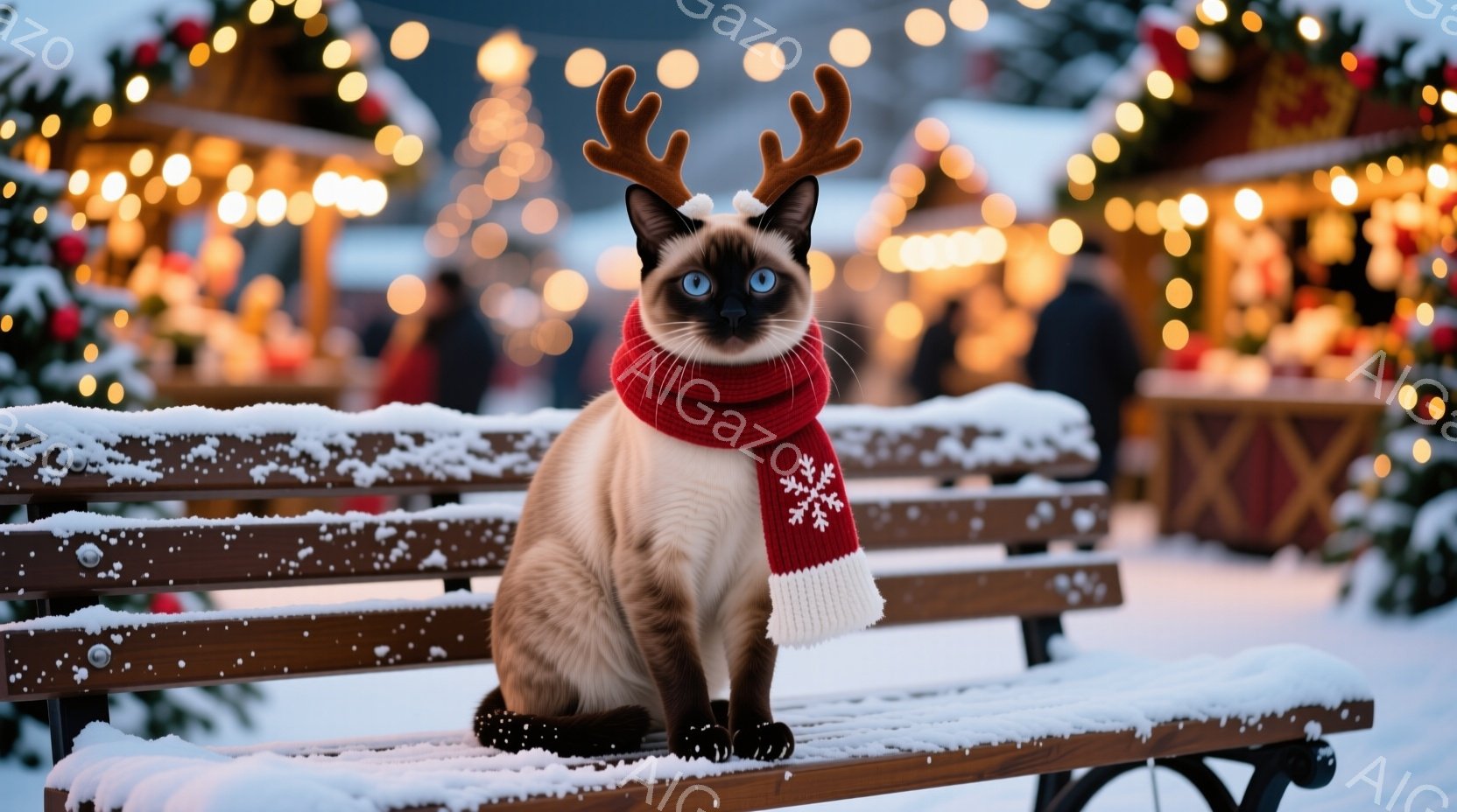 シーマ猫がクリスマスをテーマにした飾りを身につけ、雪で覆われたベンチに座っている。緑と赤のストライプで、トナカイの顔が刺繍されたマフラーを巻き、頭には小さなトナカイの角をつけている。背景にはクリスマスマーケットのような賑やかな風景がぼやけており、暖かい光で照らされ、雪が降っている様子が伺える。