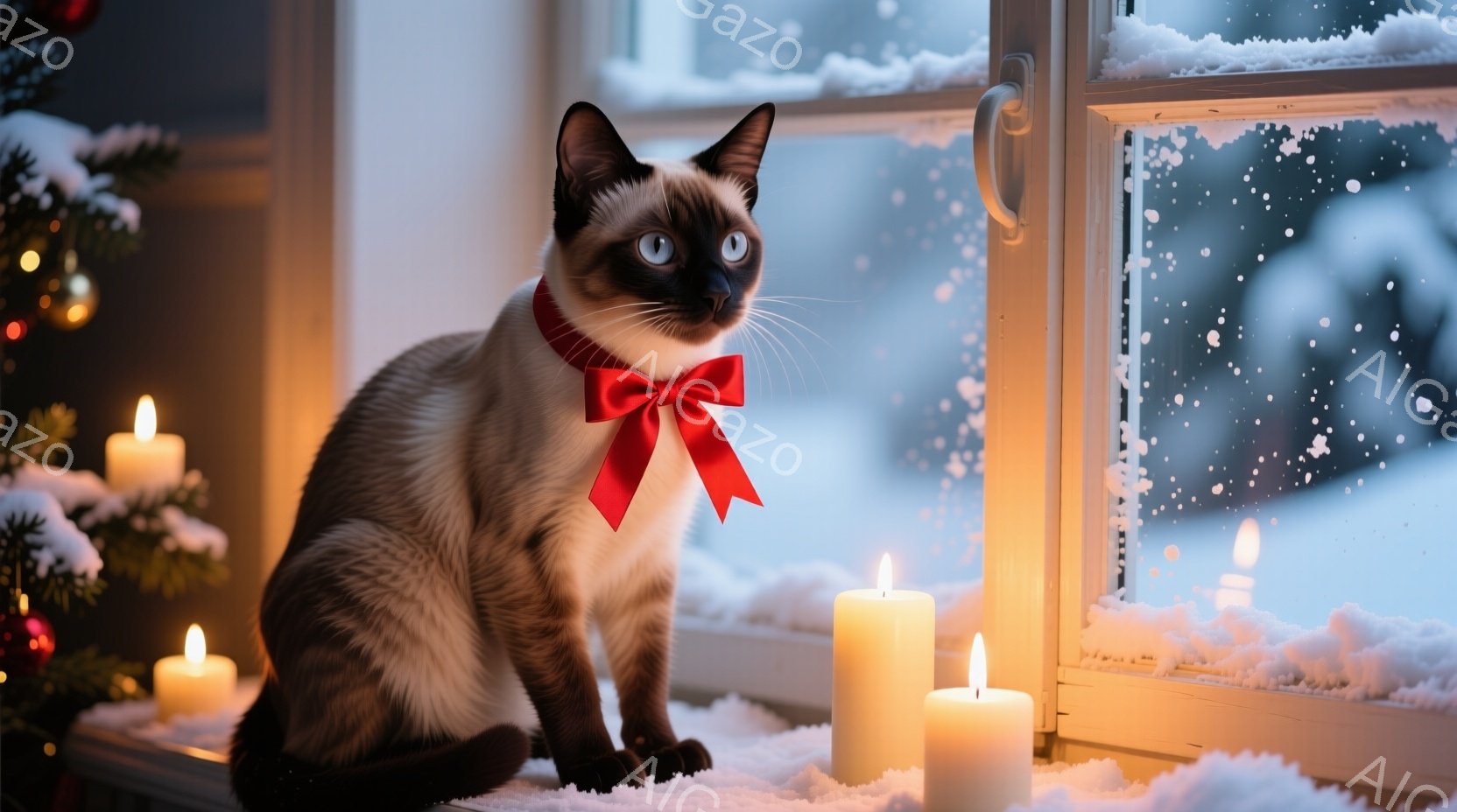 シーマル猫が窓辺に座り、赤いリボンを首に巻いています。雪が降る冬の景色を背景に、数本の火が灯ったキャンドルが猫の周りに置かれ、暖かく穏やかな雰囲気を醸し出しています。背景にはぼんやりとクリスマスツリーの飾りが見え、全体として穏やかで冬らしい雰囲気が漂っています。