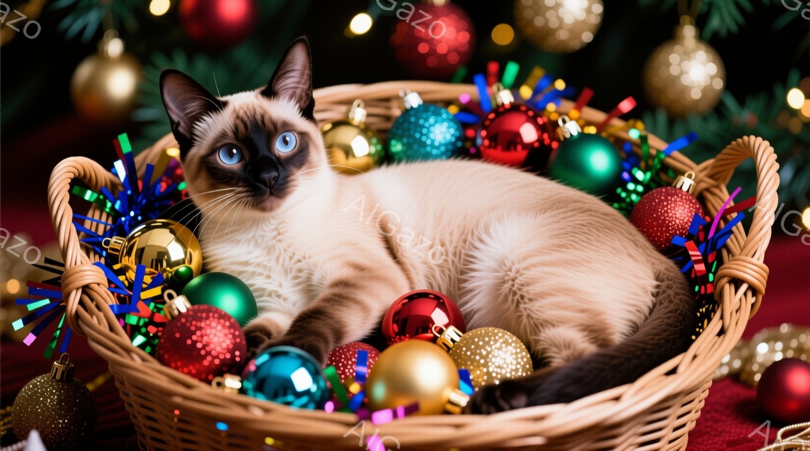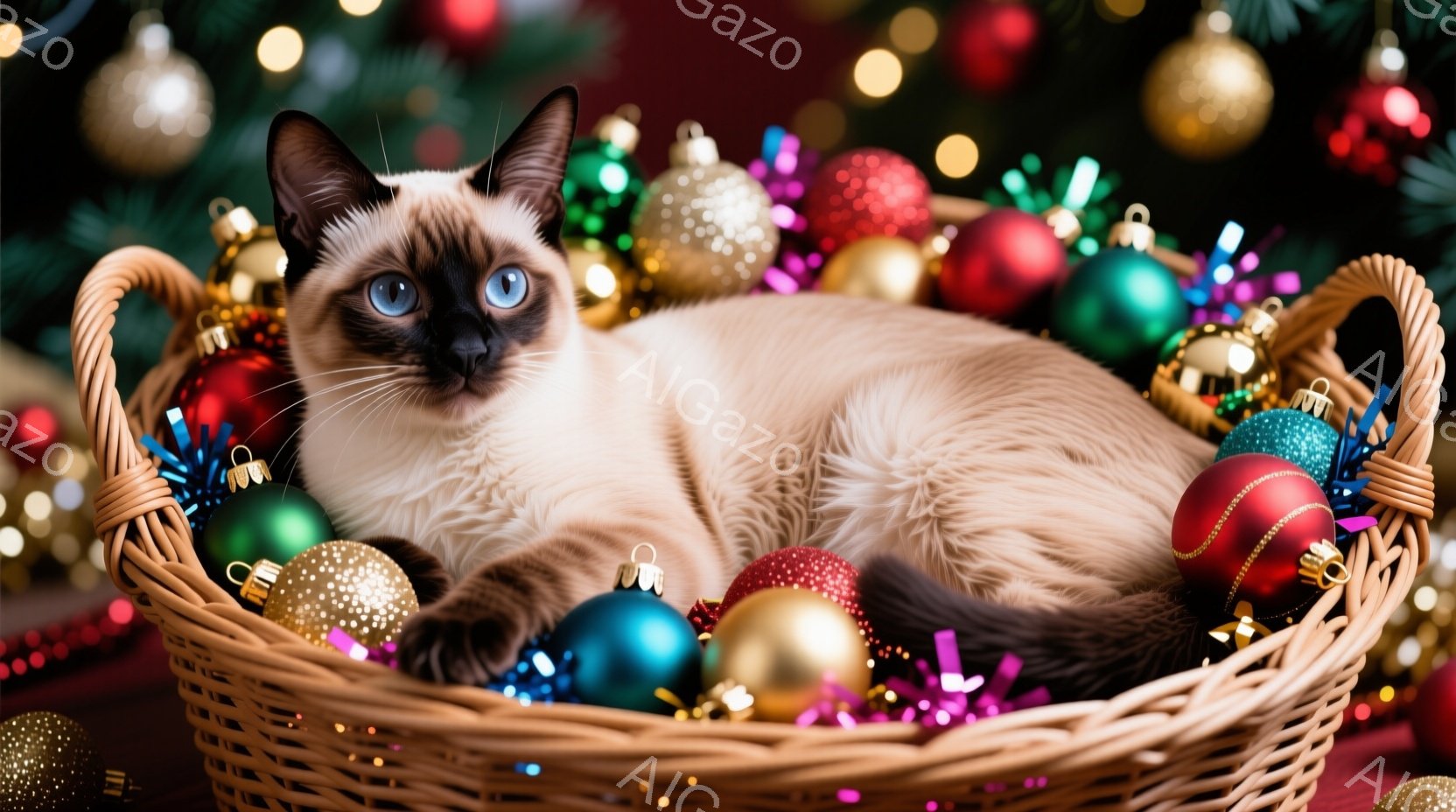 シーマーズ猫が、クリスマスオーナメントで溢れた編み込みの籠の中に横たわっています。猫は明るい青い目を持ち、リラックスした表情で穏やかに見つめています。背景にはぼやけたクリスマスツリーと、キラキラと輝く電飾が見え、温かくお祝いムードが漂っています。