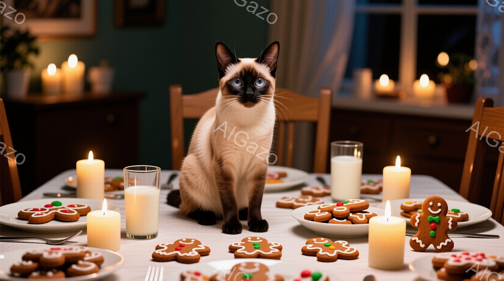 シーマーズ猫が、ジンジャーブレッドクッキーとキャンドルが並んだ食卓の中心に座っています。猫は正面を見ており、落ち着いた表情をしています。背景にはぼやけたクリスマスツリーや家具が見え、暖かく穏やかなクリスマスの雰囲気が漂っています。