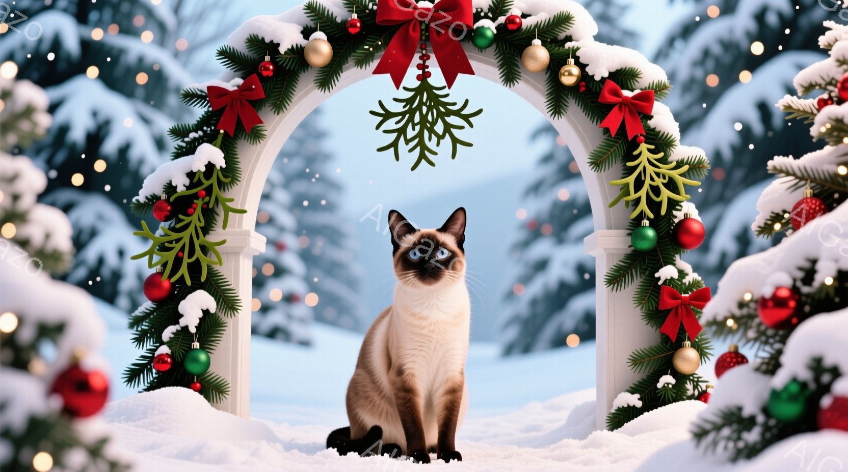 シーマル猫が雪景色の中で白いアーチの前に座っています。アーチはクリスマスツリーの飾りと赤いリボンで飾られ、雪が静かに降り積もっています。暖かく穏やかなクリスマスの雰囲気が漂い、猫は落ち着いて座り、冬の風景を楽しんでいるようです。