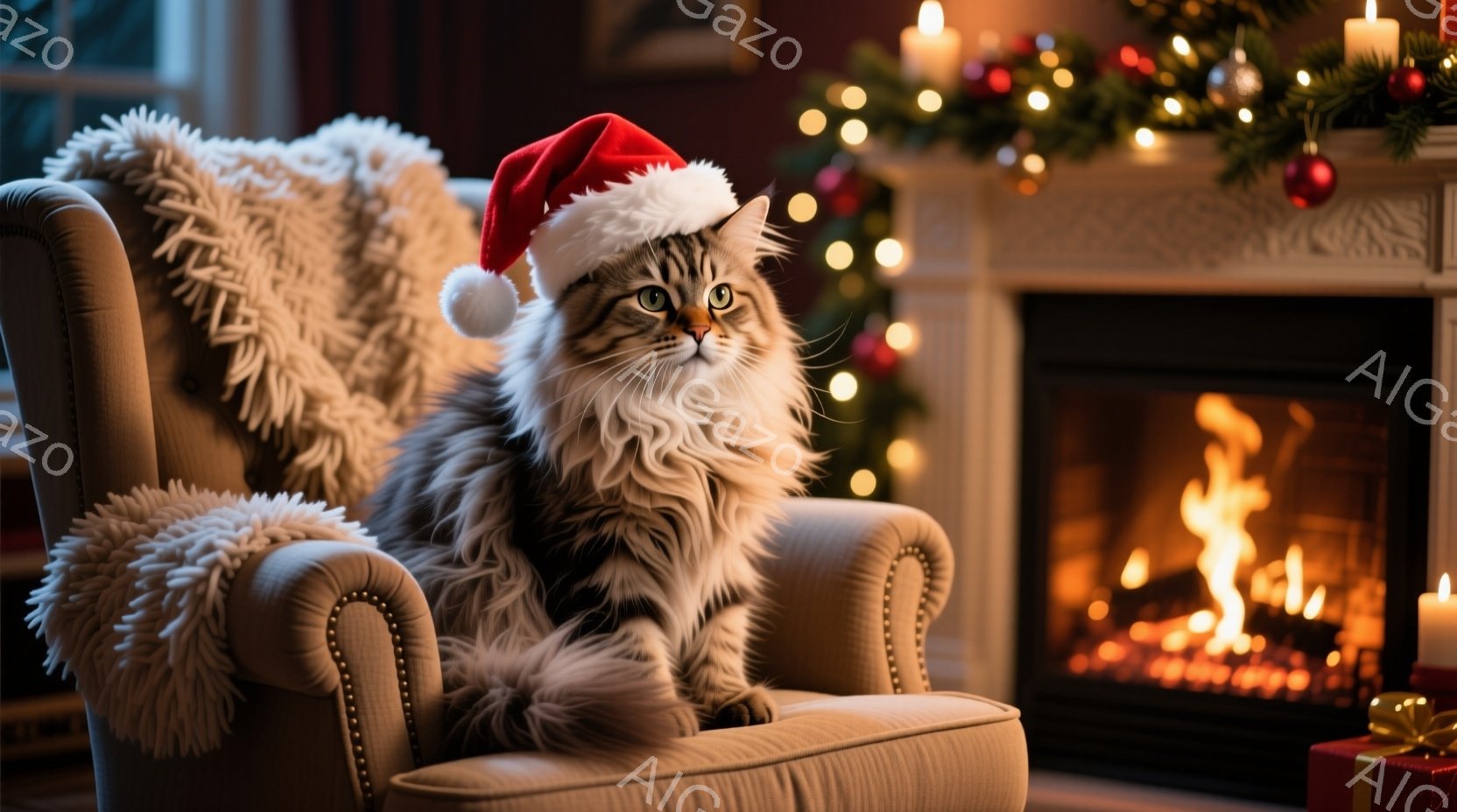 長毛の猫が、クリスマスの帽子をかぶり、肘掛け椅子の座面に座っている。背景には、暖炉の火が燃え盛っており、クリスマスツリーの光が暖かく照らし、プレゼントボックスも見える。全体的に、温かく、居心地の良い、クリスマスの雰囲気が漂っている。