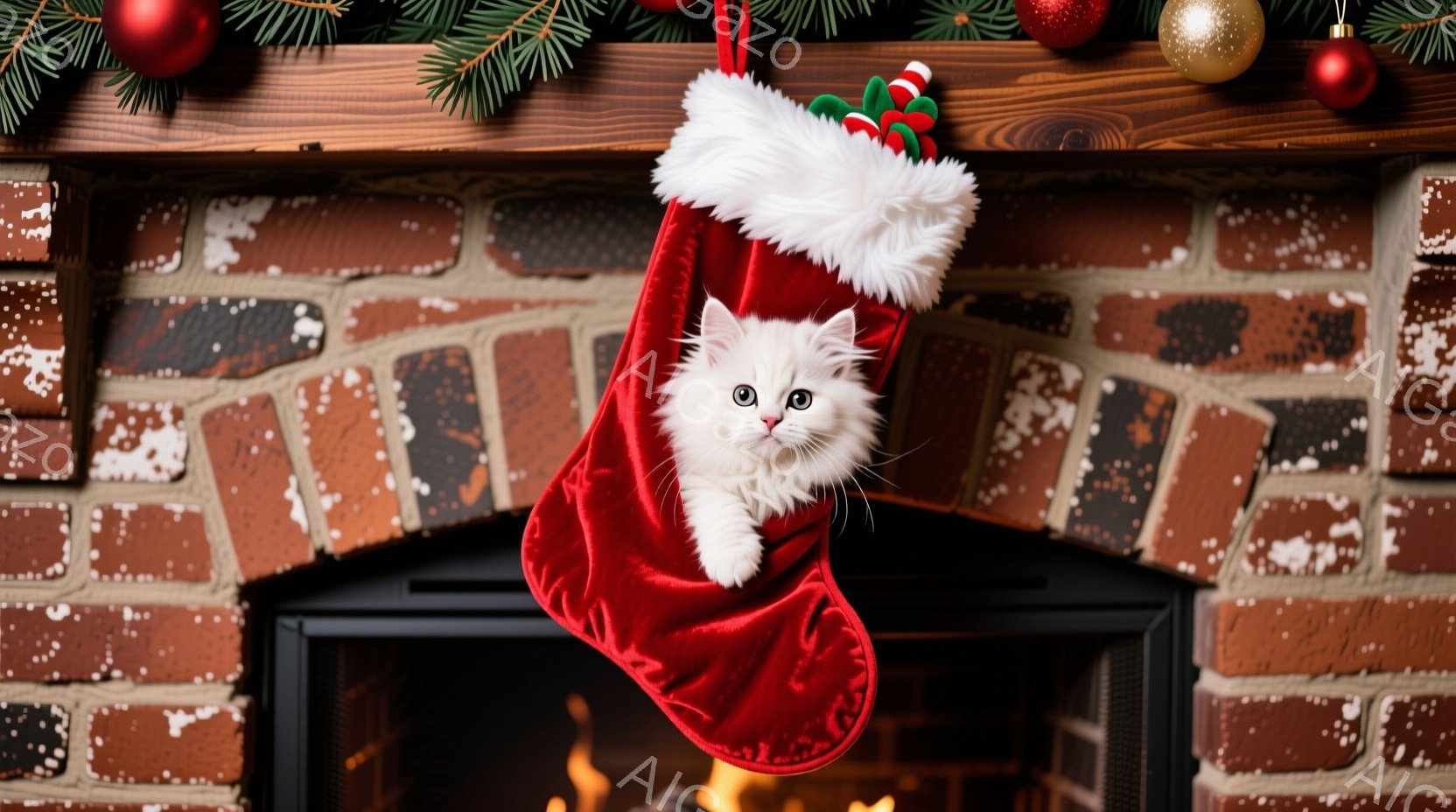 白い子猫が赤いクリスマスストッキングの中に座っており、好奇心と少しの困惑が入り混じった表情でカメラを見つめている。ストッキングは暖炉の真上に掛けられており、背景には燃え盛る暖炉とクリスマスツリーの飾りがぼんやりと見える。全体的に暖かく、遊び心のある、クリスマスの雰囲気が漂う画像である。