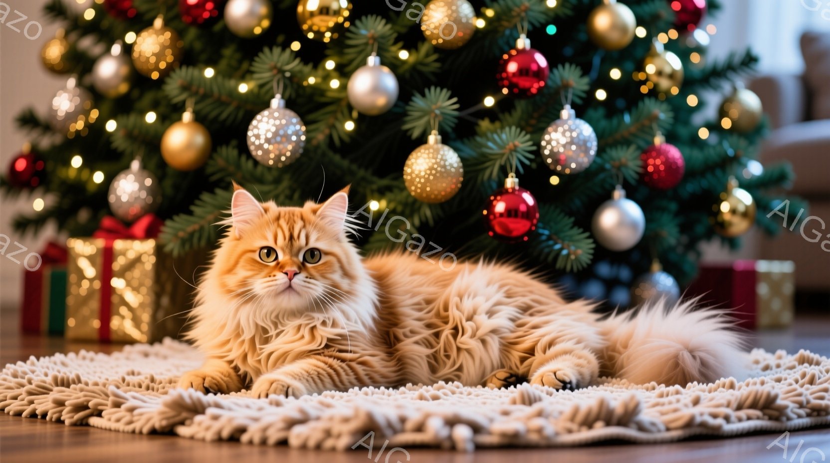 明るいフローリングの上に、ふわふわのオレンジ色の長毛猫が丸まって横たわっています。背景には、様々なオーナメントで飾られたクリスマスツリーがあり、温かい光が猫を照らしています。全体的に、暖かく、穏やかで、クリスマスの雰囲気が漂う画像です。
