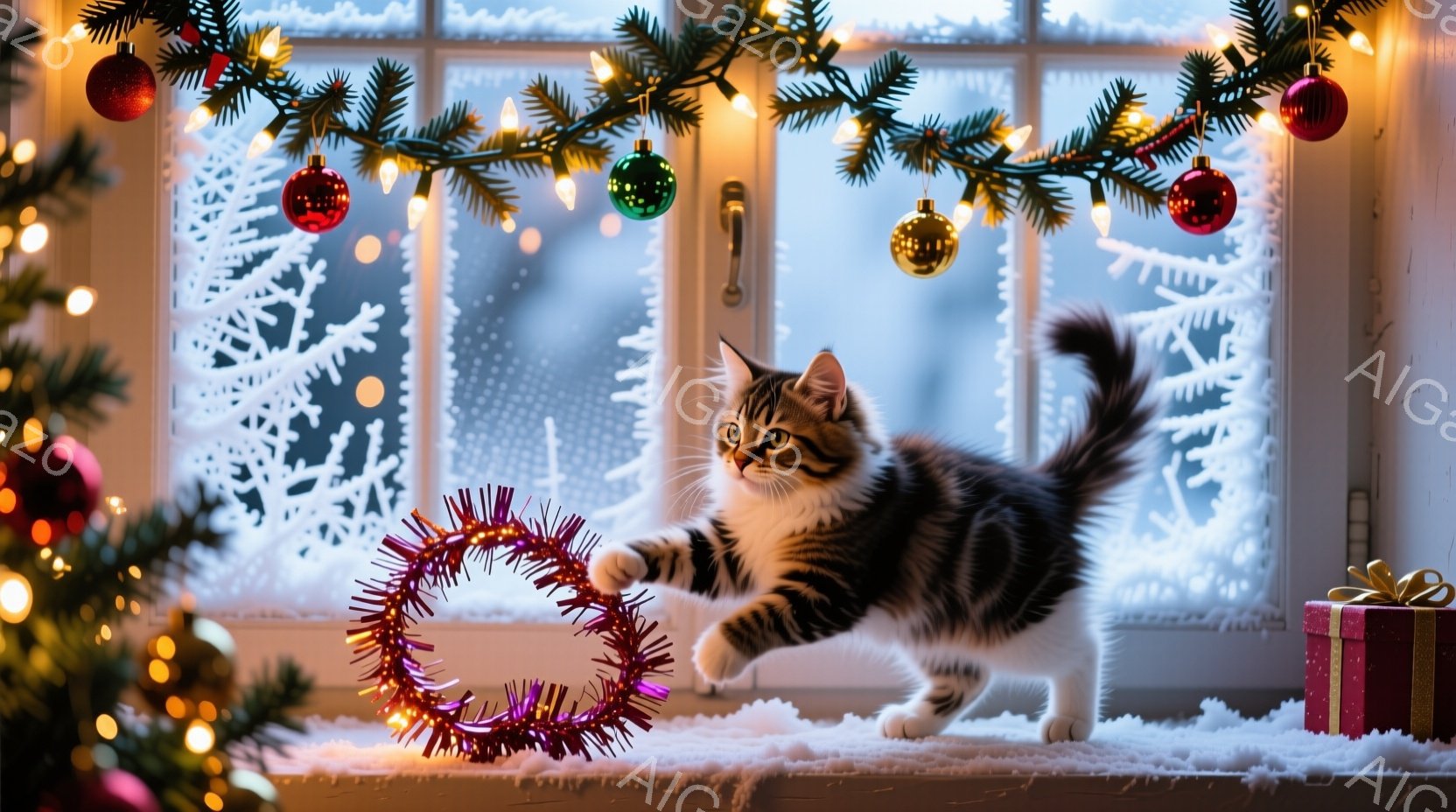窓辺にいる縞模様の子猫が、クリスマスツリーの飾りを引っ張って遊んでいます。背景には雪が降る冬の風景が広がり、白い雪の結晶が窓ガラスに描かれています。暖かい光と可愛らしい猫の姿から、クリスマスの穏やかで幸せな雰囲気が伝わってきます。