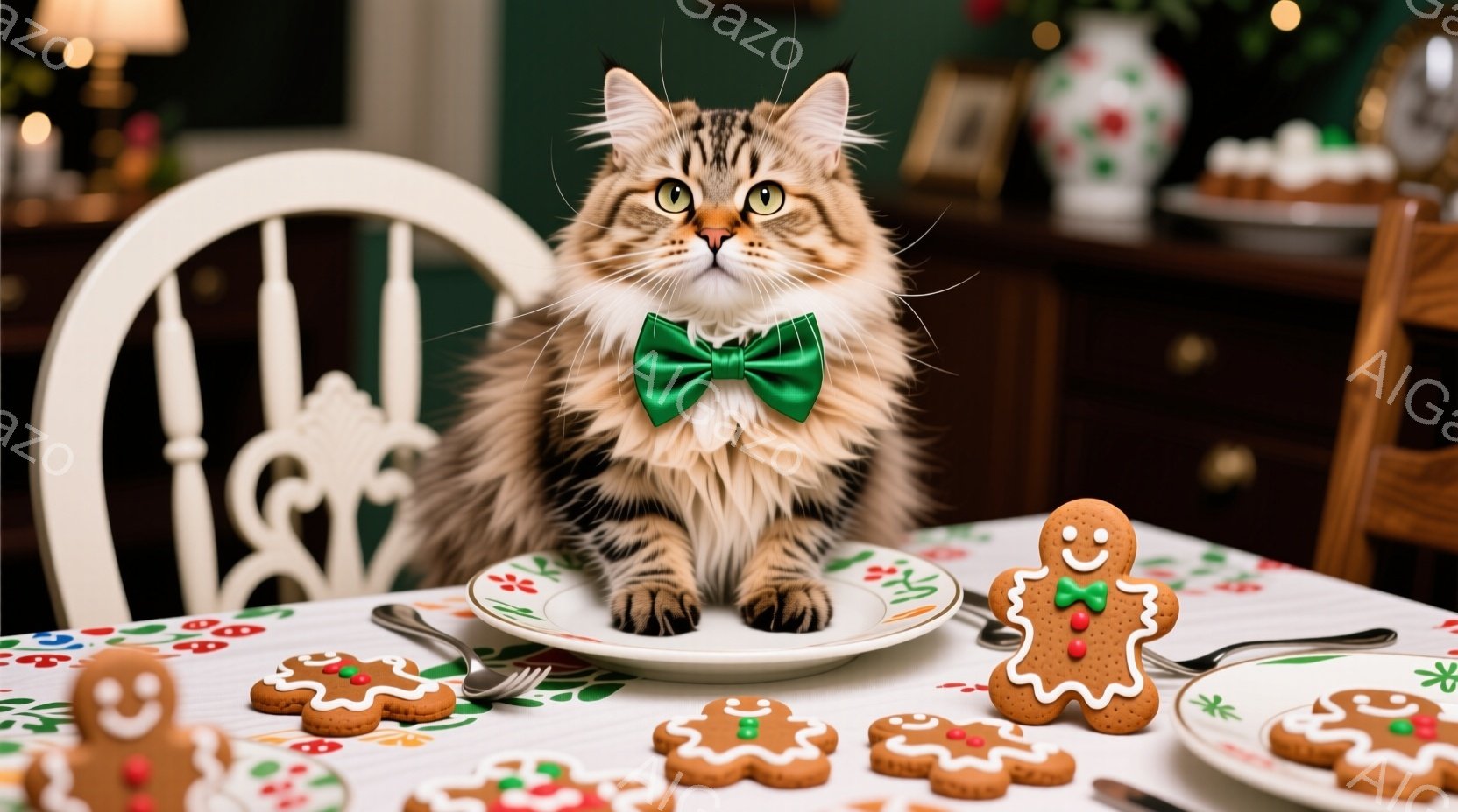 縞模様の猫が、緑のリボンをつけて椅子に座り、ジンジャーブレッドが並んだテーブルを見つめています。背景にはクリスマスツリーが飾られ、暖かくお祝いムードが漂っています。ジンジャーブレッドマンのクッキーが猫の周りを囲み、陽気なクリスマスの雰囲気を強調しています。
