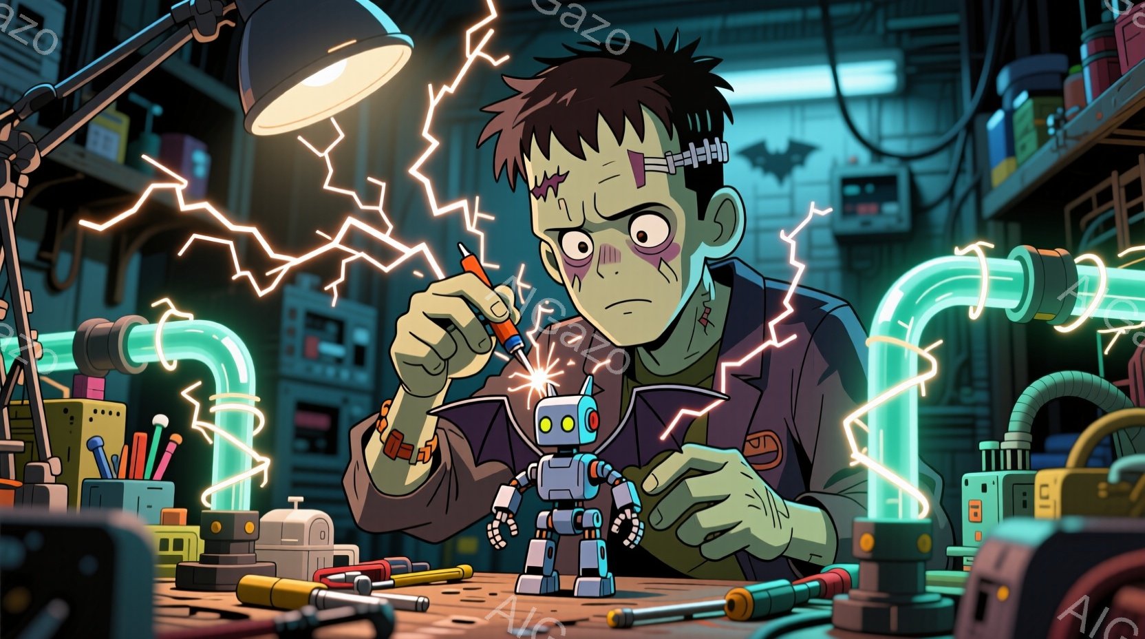 緑色の肌をした少年が、実験台で小さなロボットを修理しています。彼は茶色の髪で、少し困ったような表情を浮かべており、赤いオーバーオールを着ています。背景には複雑な機械装置や配線が散りばめられており、全体的に実験室のような雰囲気で、稲妻が飛び交う様子から、科学実験が行われていることがわかります。